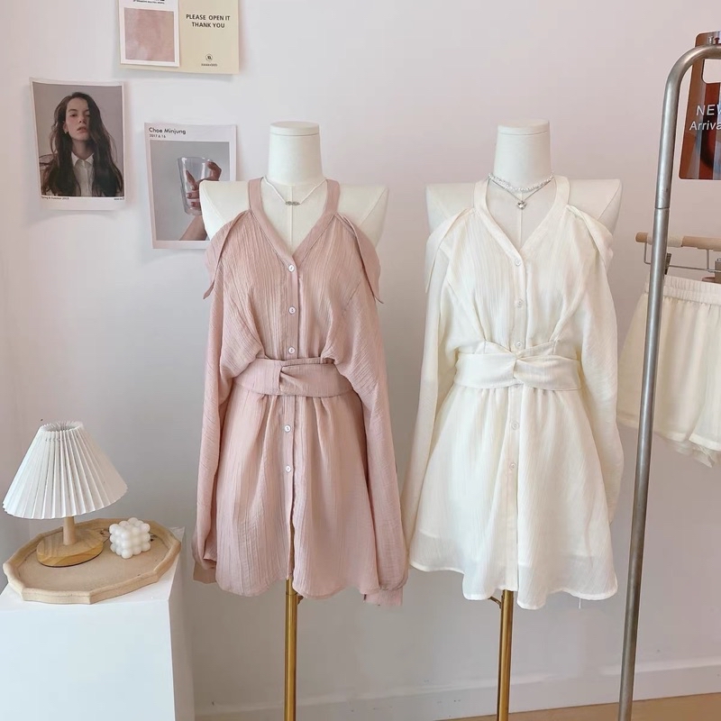 (2 lớp) Set váy áo sơ mi dài tay hở vai hai lớp cổ chữ V kèm quần short ngắn mùa hè mới nhất