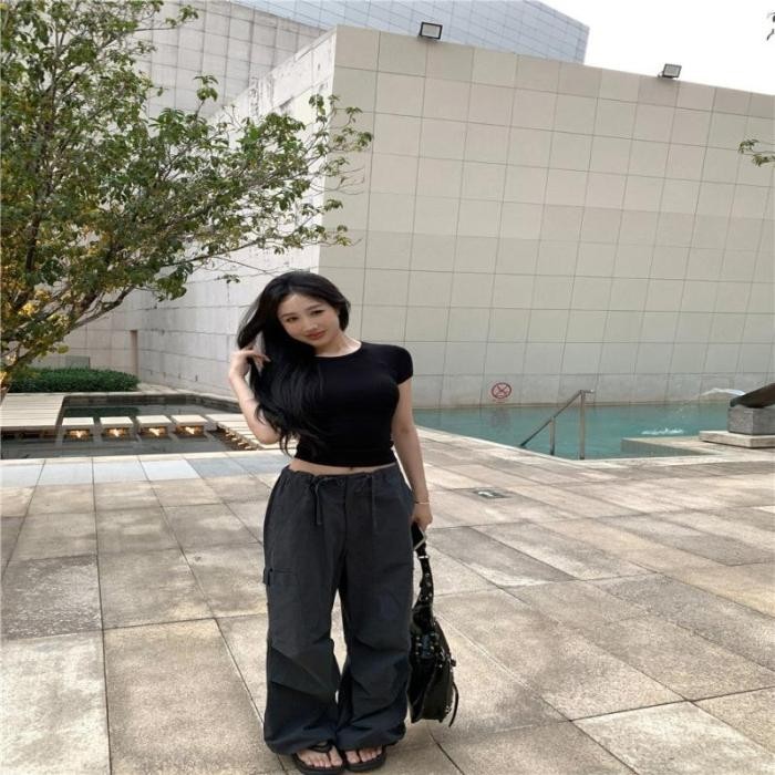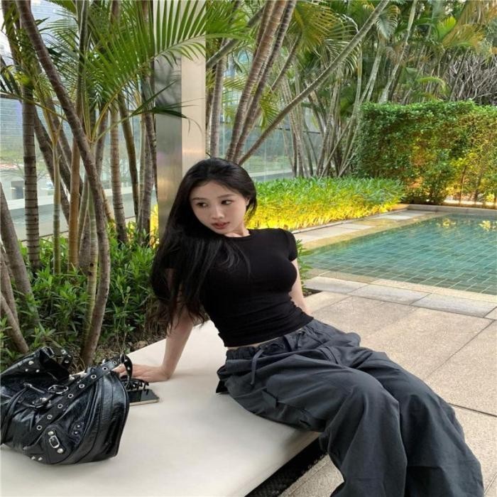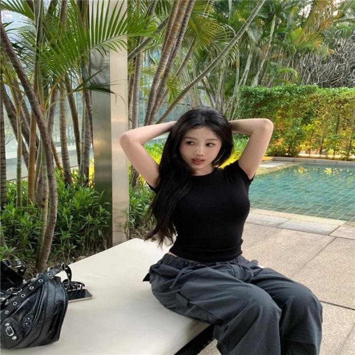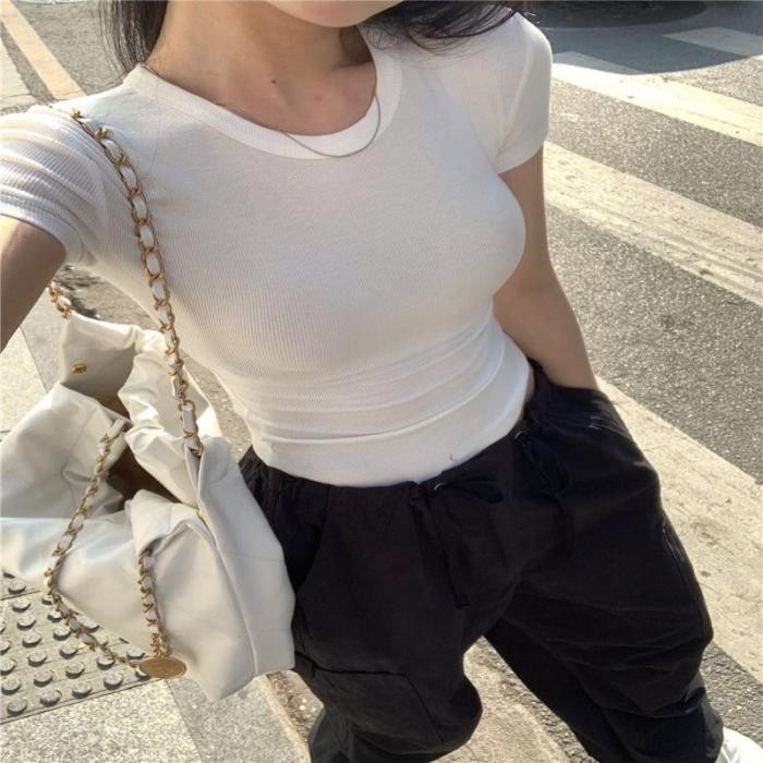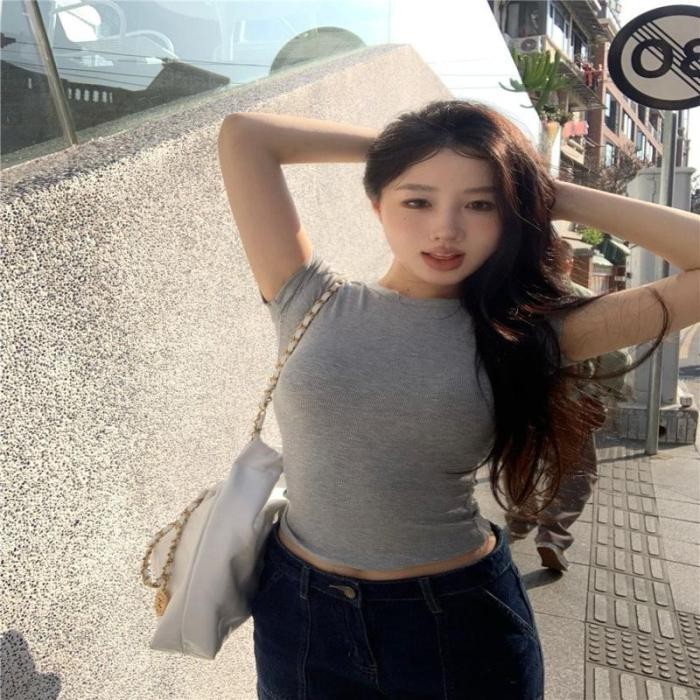 Áo Croptop Ngắn Tay Cổ Tròn Basic - Vải Thun Trơn Dày Co Giãn Thoáng Mát, Ôm Body Sexy