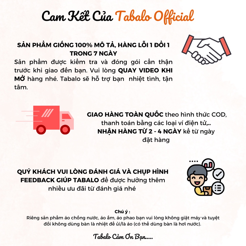 + Miễn phí nếu Tabalo giao sai mẫu, hàng bị lỗi từ phía nhà sản xuất, hàng hư hỏng trong quá trình vận chuyển, sản phẩm khác với mô tả của Tabalo.