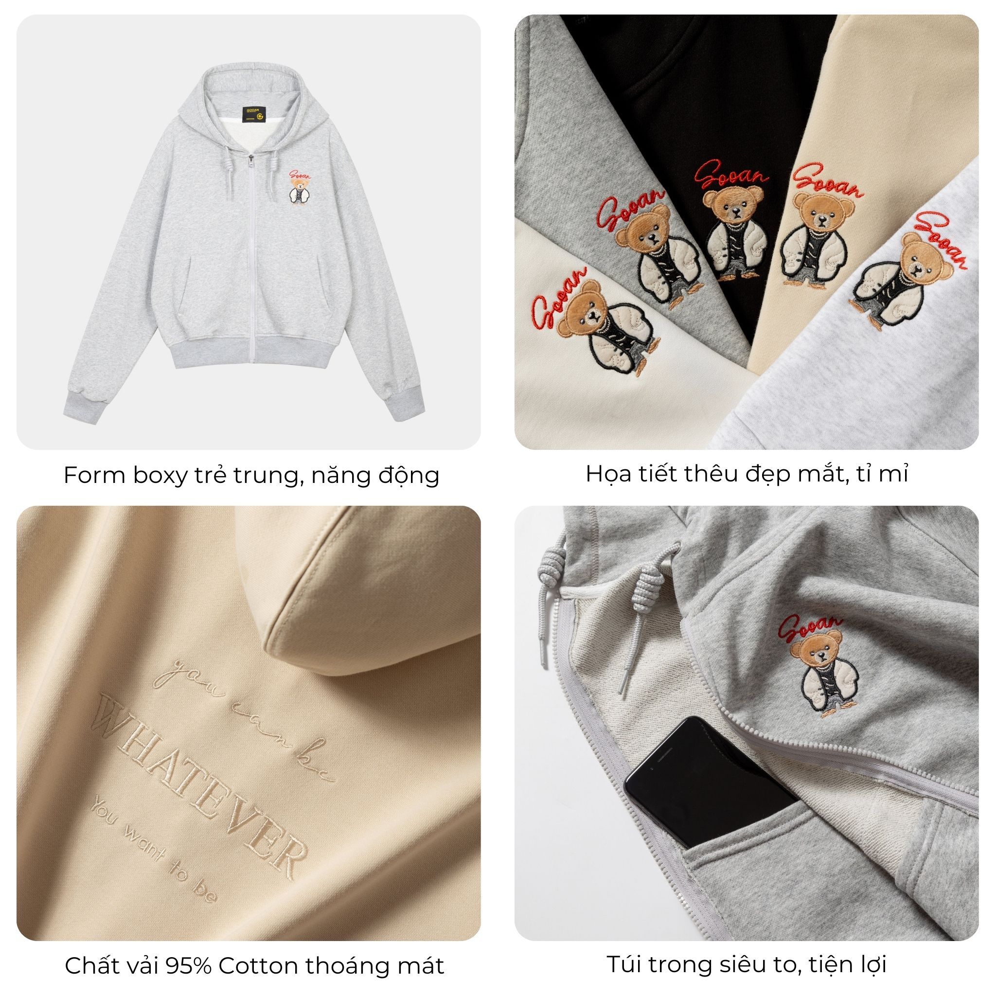 Áo Khoác Nỉ Chân Cua Hoodie Zip Gooan Gấu Teddy - Form Boxy Unisex