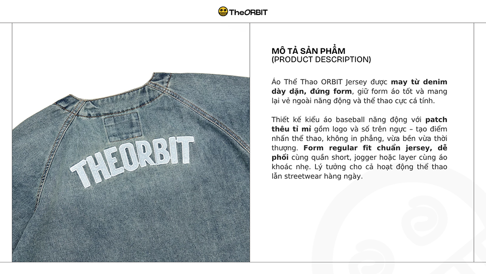 ORBIT BASEBALL DENIM JERSEY - Một sản phẩm mới toanh được thiêt kết theo form baseball nhưng lại sử dụng chất liệu denim độc đáo với những hình thêu cắt laser và thêu 3D. Một em áo hoàn toàn phù hợp cho mọi người muốn mặt thoải mái nhưng vẫn không kém phần phong cách.