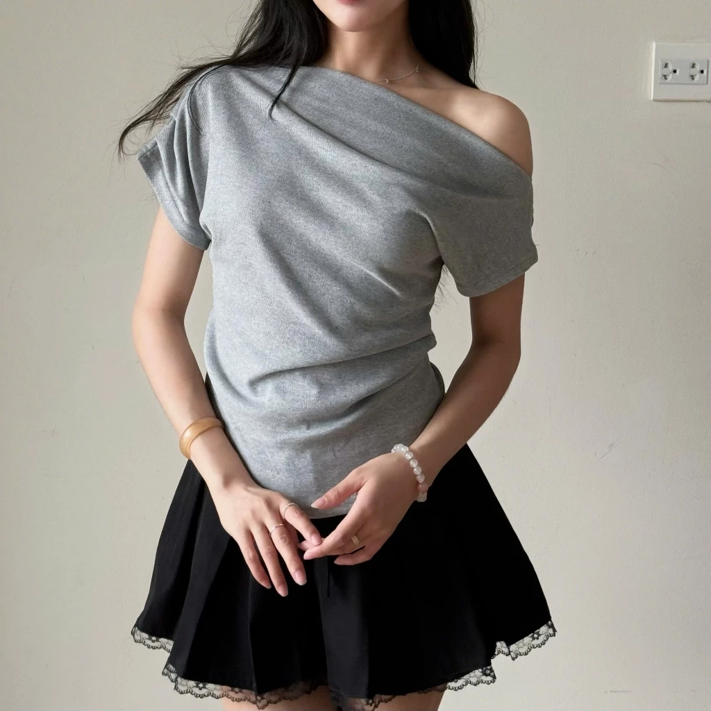 Áo Thun Lệch Vai Xếp Ly, Áo Kiểu Sườn Nhún Eo Điệu Đà, Áo Phông Form Vừa Chất Vải Co Dãn Mềm Mịn HA500