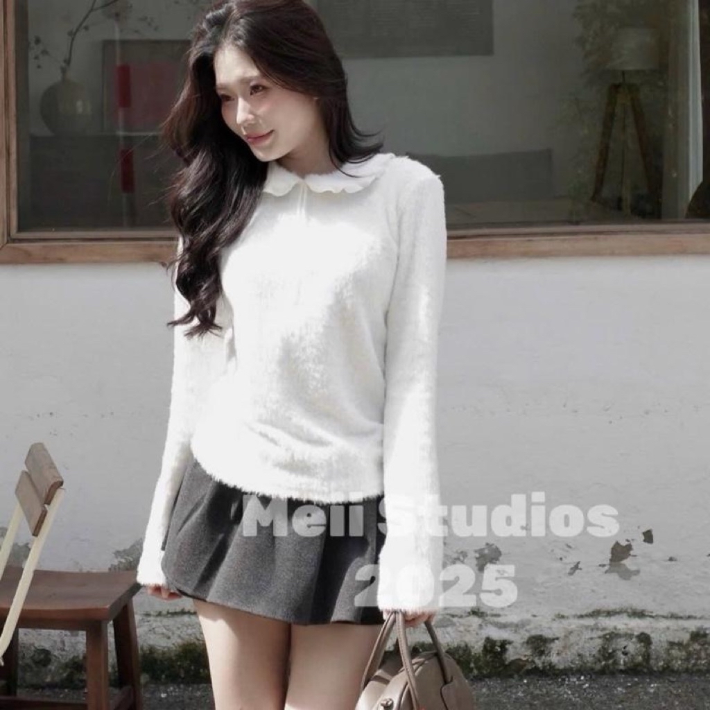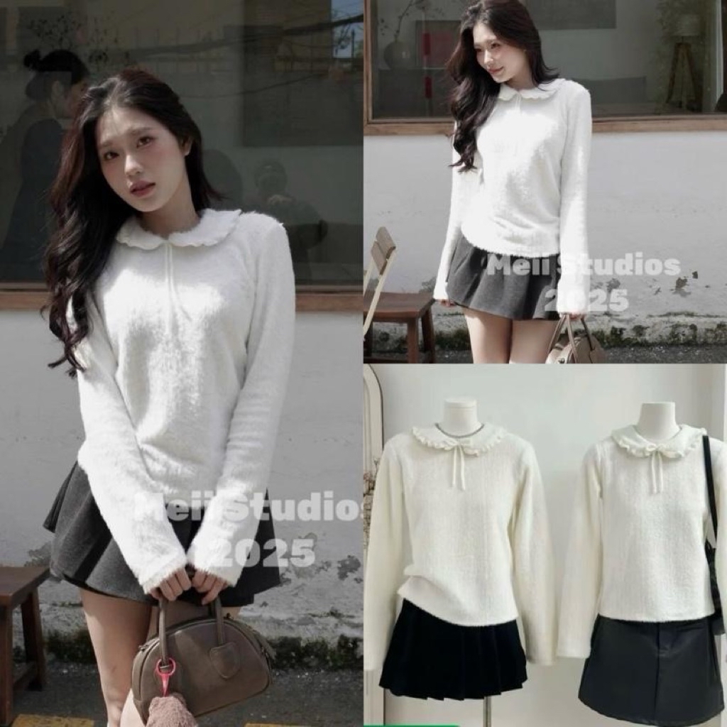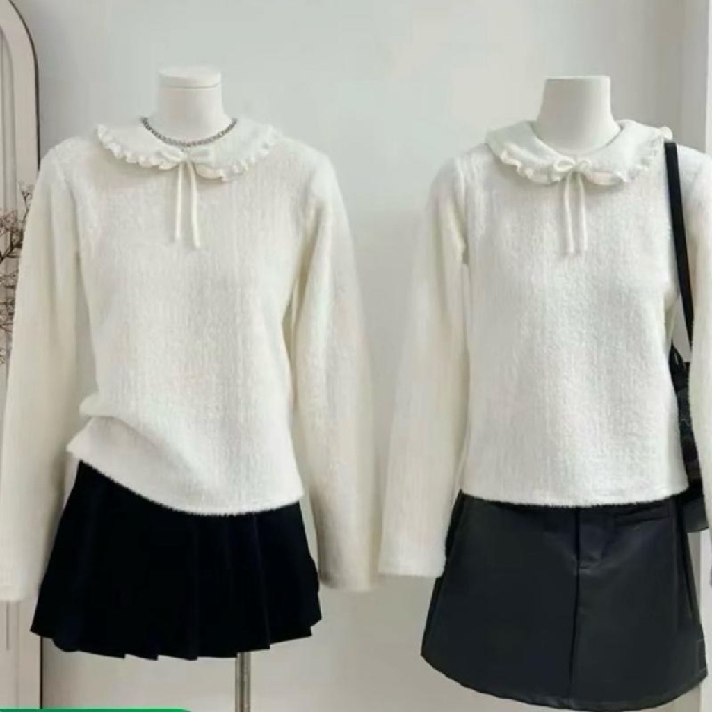 Chiếc áo len lông mịn cổ bèo buộc nơ mang đậm vibe tiểu thư Hàn Quốc, vừa dễ thương vừa thanh lịch. Áo được làm từ chất len lông mềm mịn, chạm vào rất êm, giữ ấm tốt nhưng vẫn thoáng, không gây bí. Phần cổ bèo viền ren nhẹ kết hợp dây nơ tạo điểm nhấn cực xinh, tôn gương mặt và giúp outfit thêm phần nữ tính.