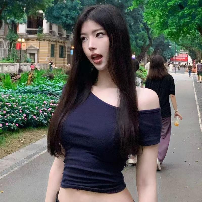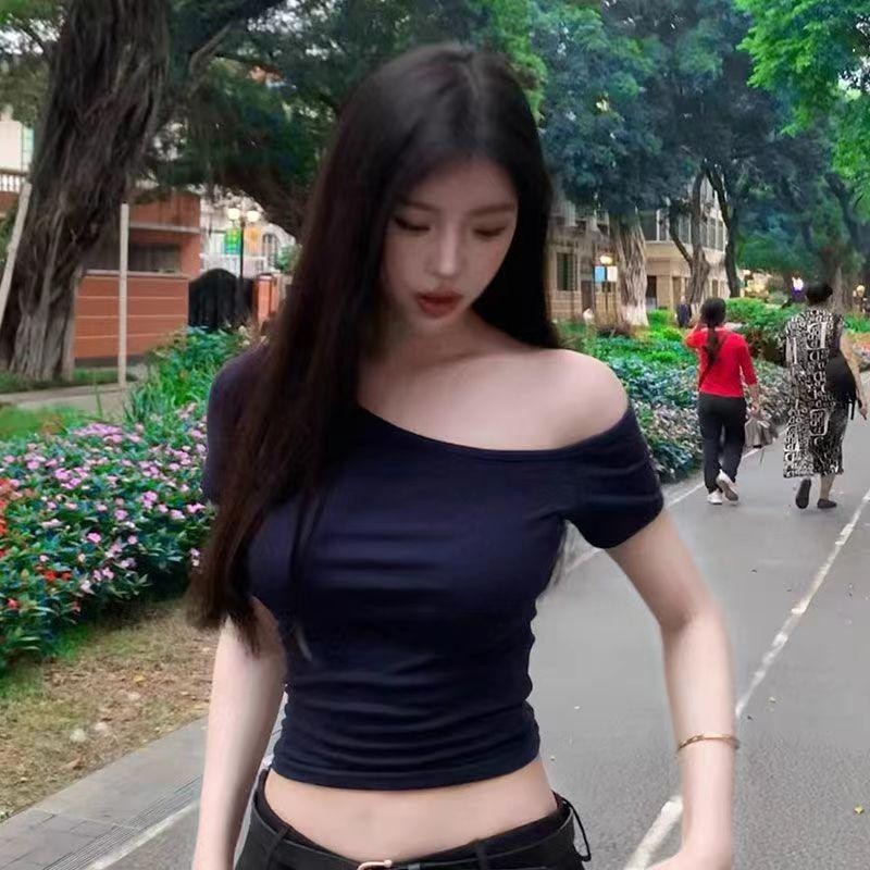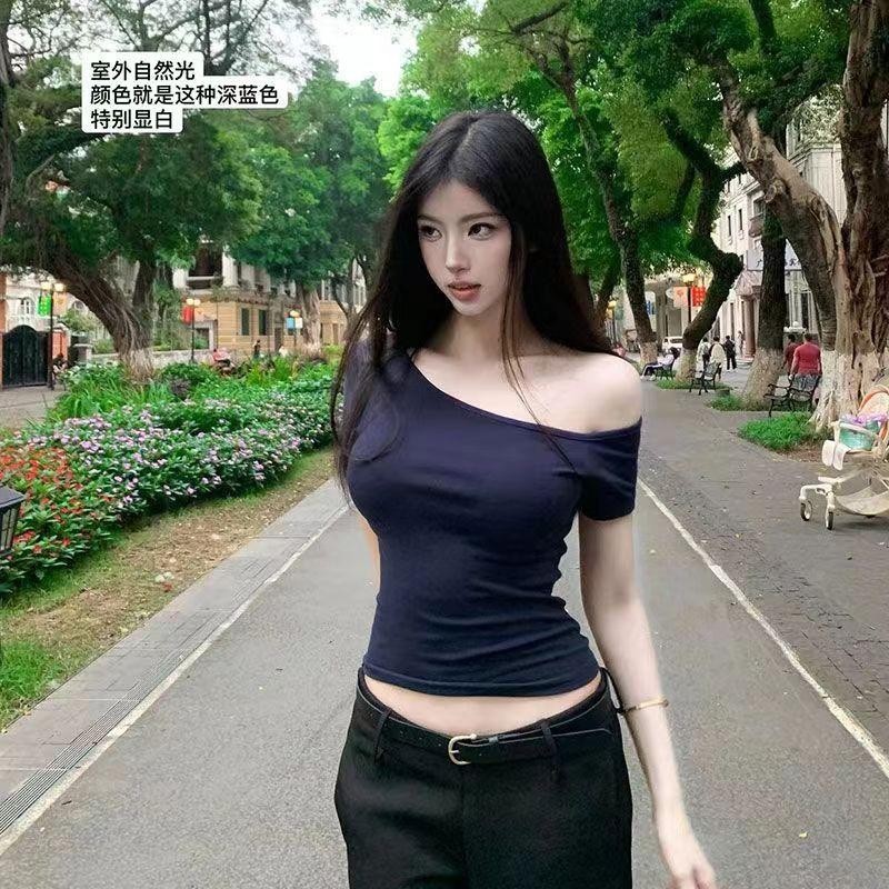Áo thun ngắn tay màu xanh lệch vai Slim-fit