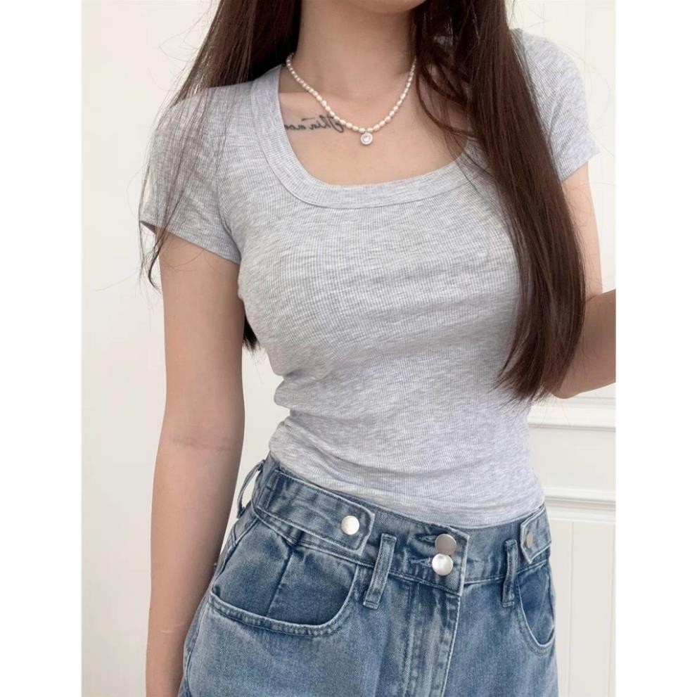 Áo thun nữ kiểu cup cổ vuông tay ngắn ôm body, áo kiểu nữ tôn dáng phong cách HQ chất tăm mềm mịn HA666