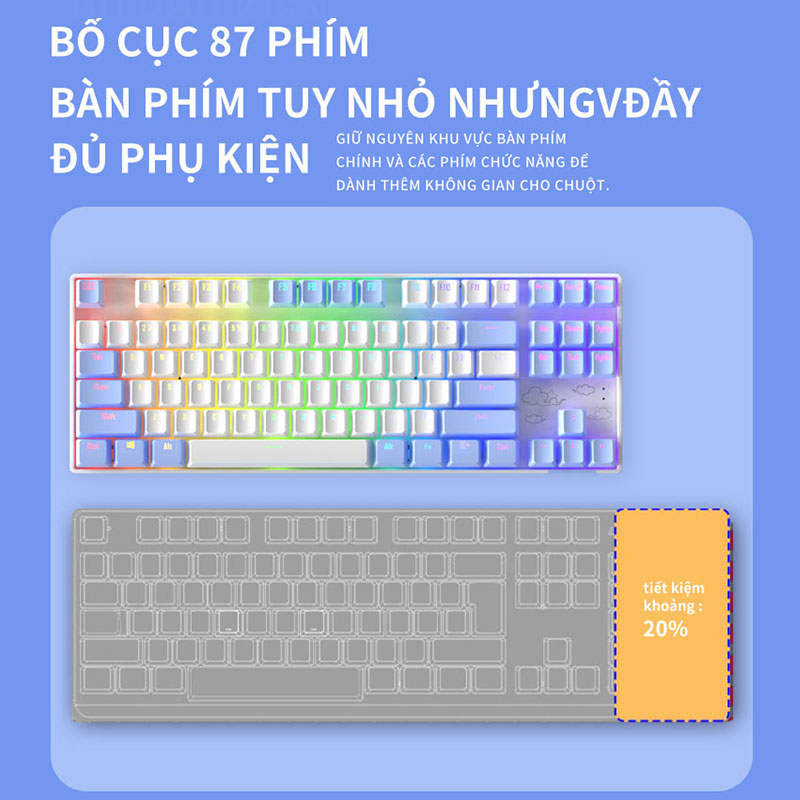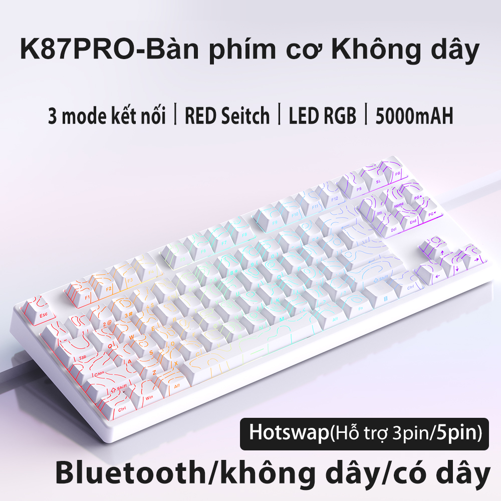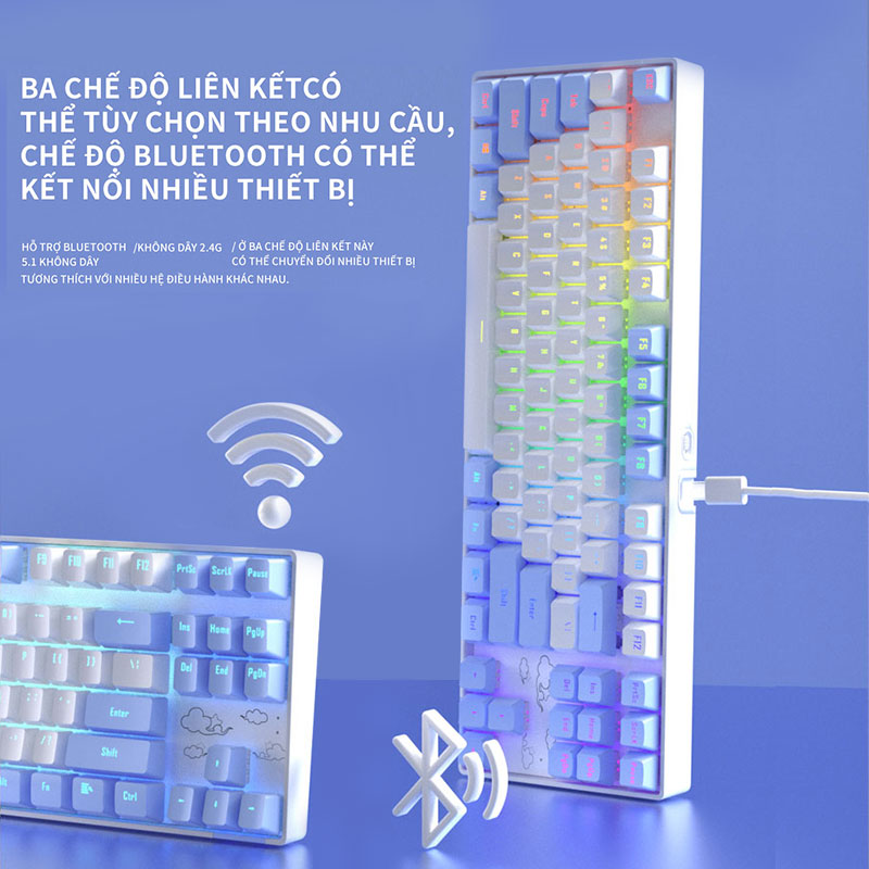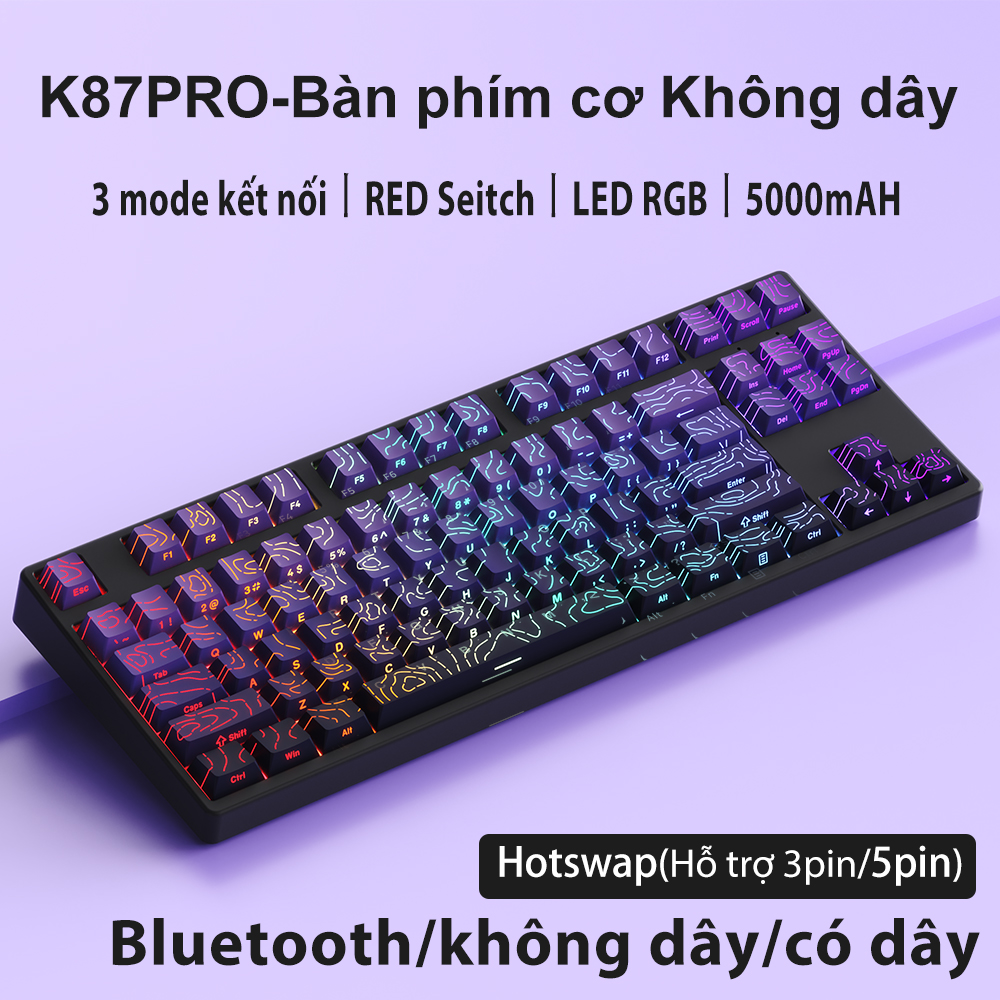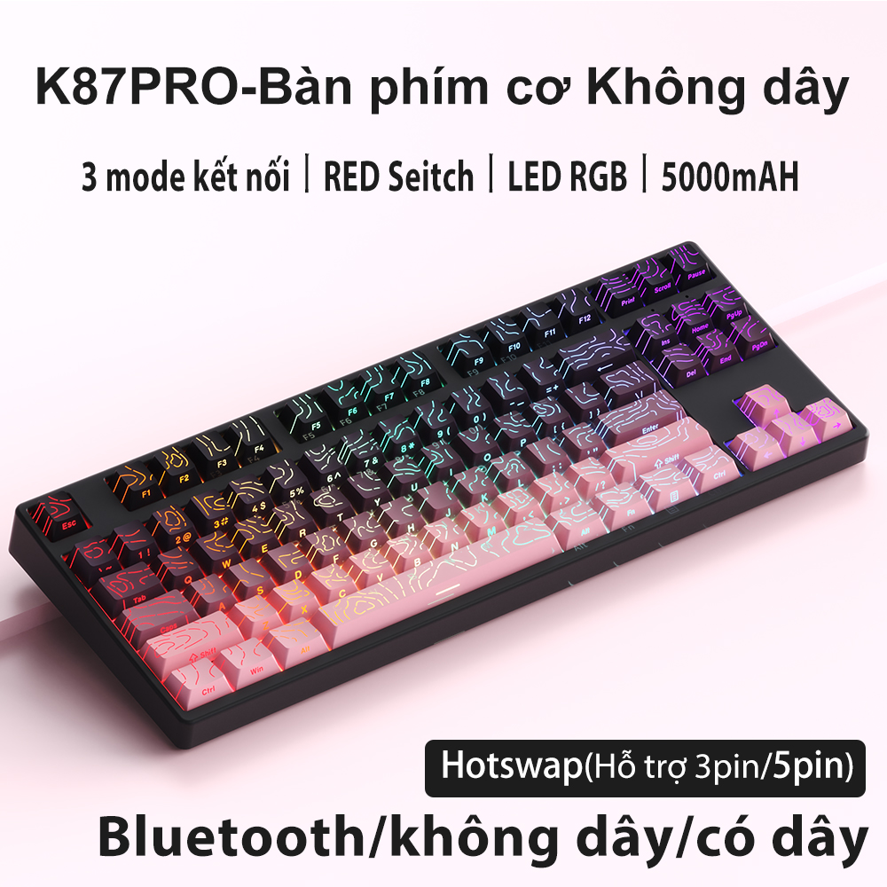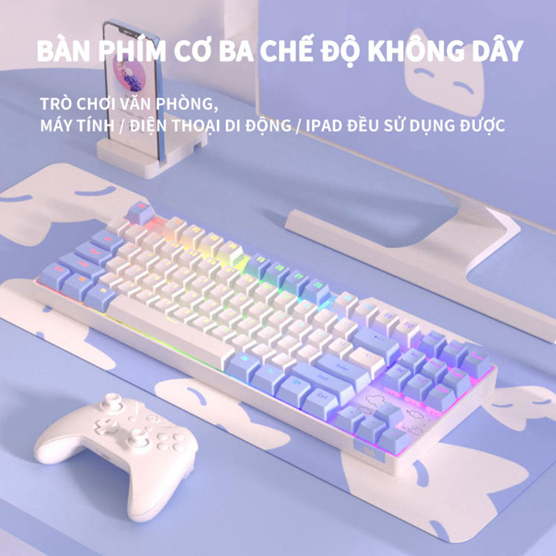 Bàn phím cơ gaming Không dây 2.4G/Bluetooth ONIKUMA Red switch 87 phím màu tím/xanh/hồng,có đèn RGB,cho máy tính/laptop