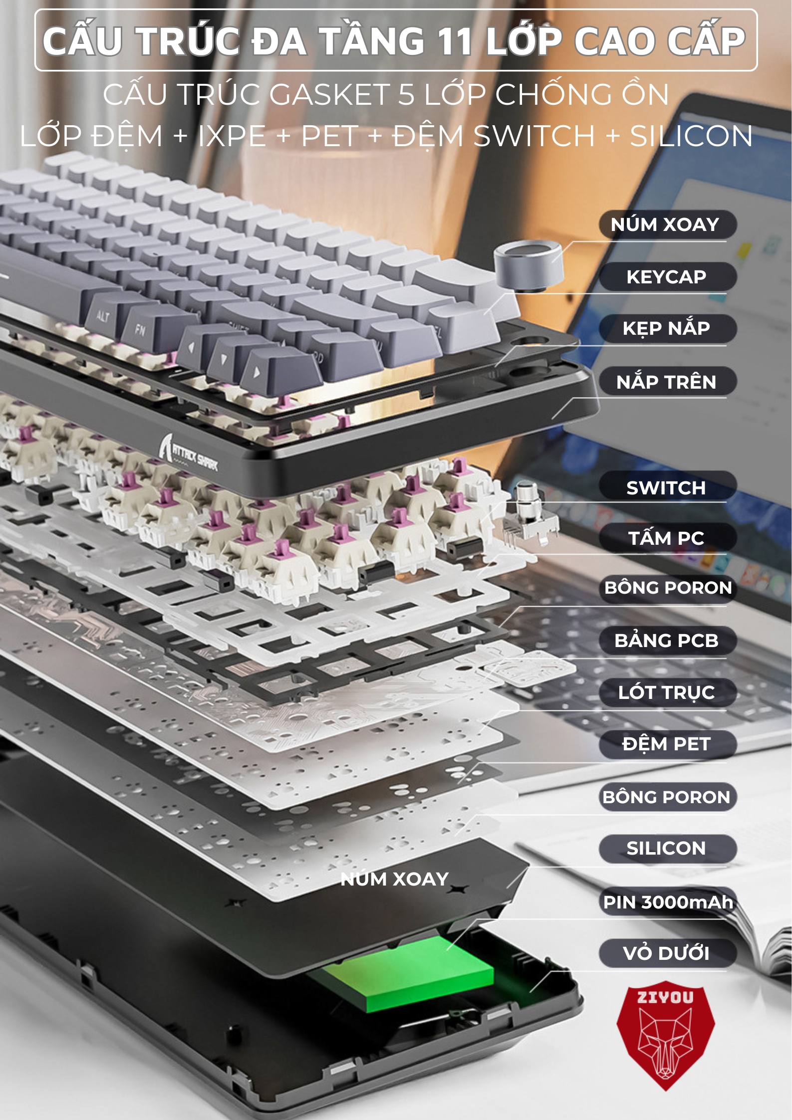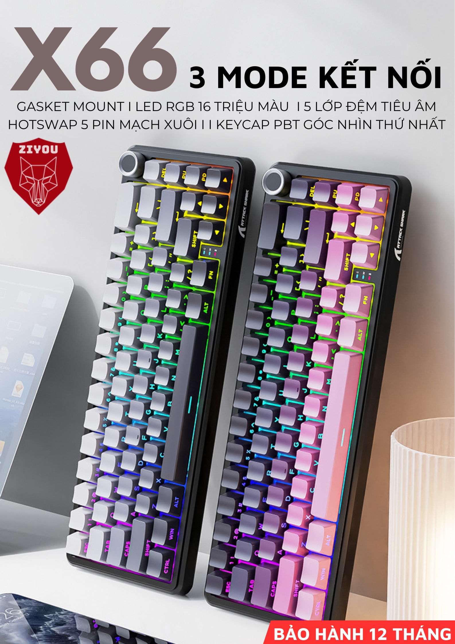 Bàn Phím Không Dây Ziyou Attack Shark X66 Led RGB Hotswap 5 Pin 3 Mode Kết Nối App Tùy Chỉnh