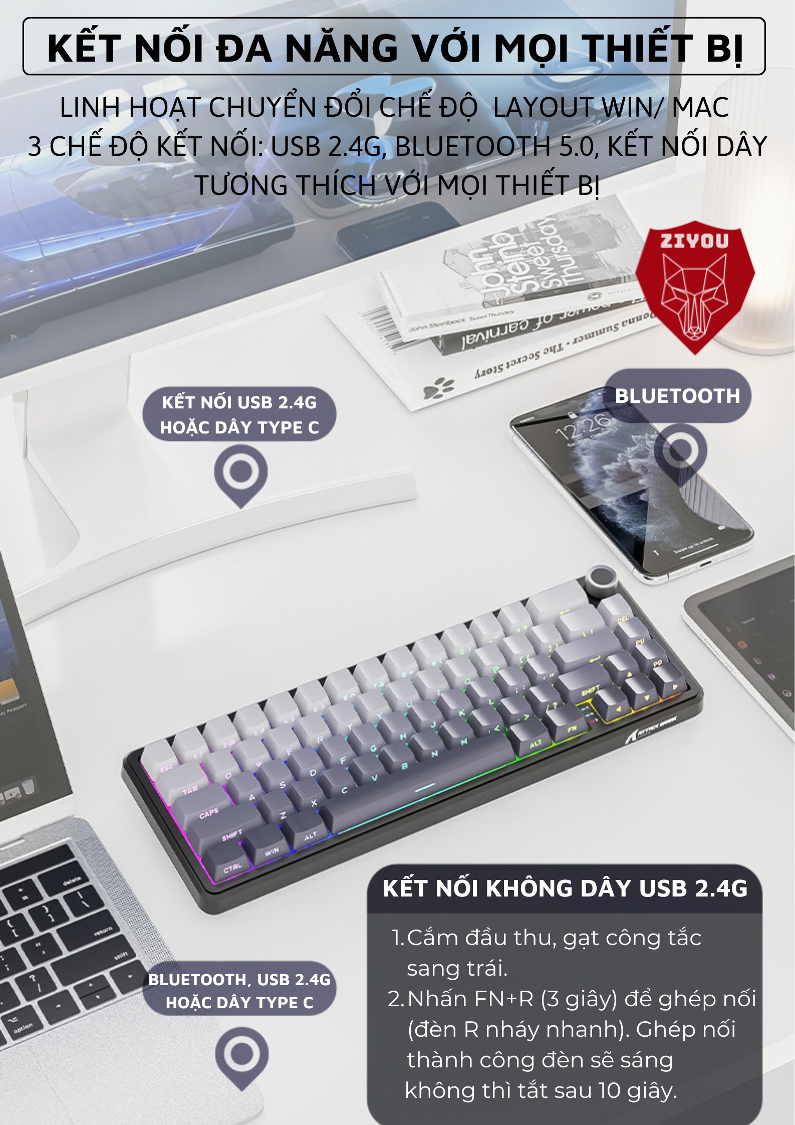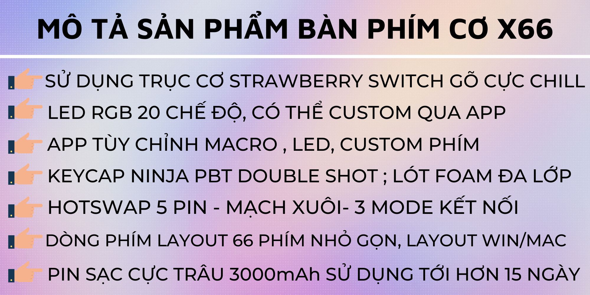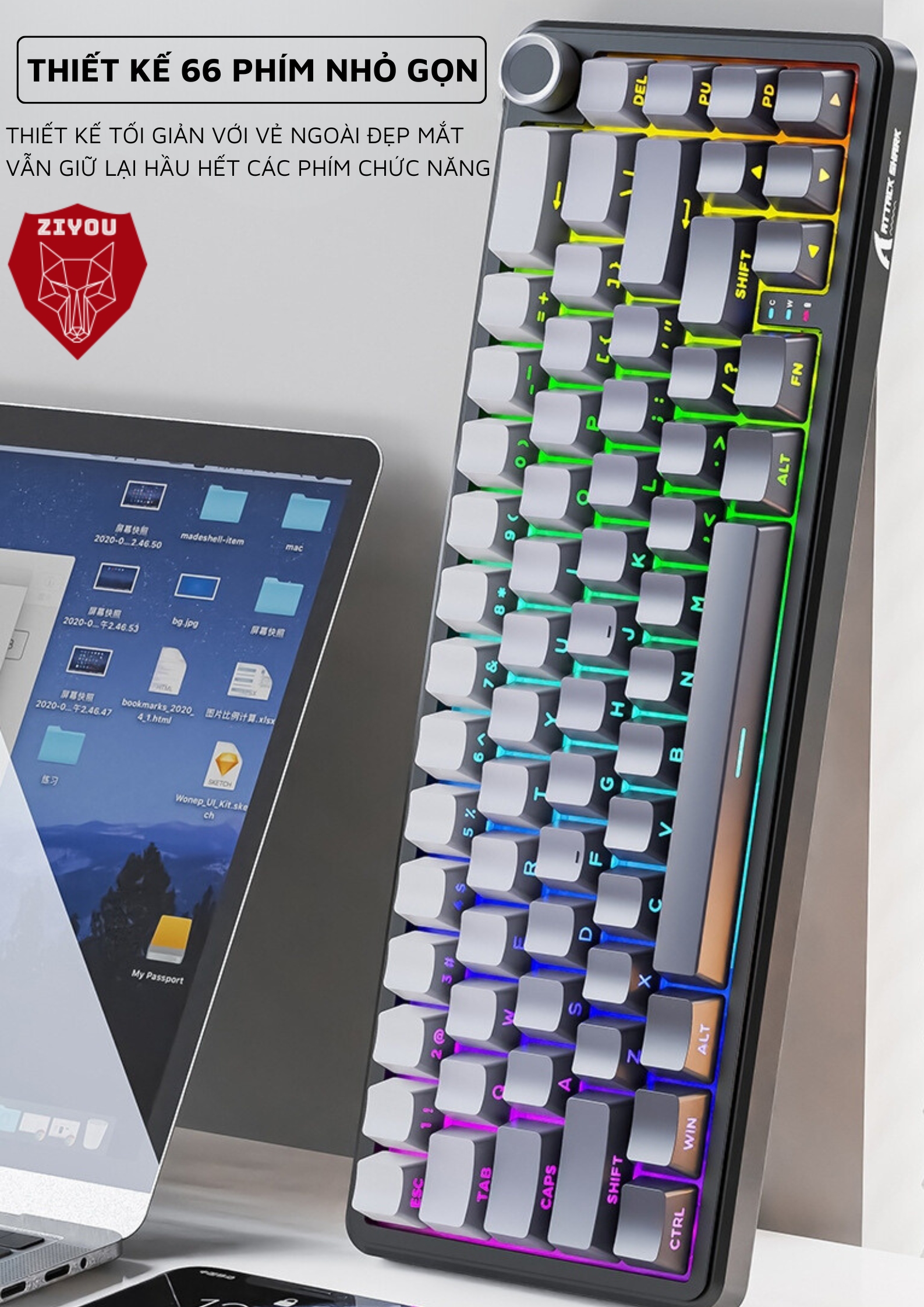 Thiết kế 66 phím nhỏ gọn: tiết kiệm không gian làm việc, hỗ trợ cả Windows và Mac, cực kỳ tiện lợi cho mọi nhu cầu sử dụng.