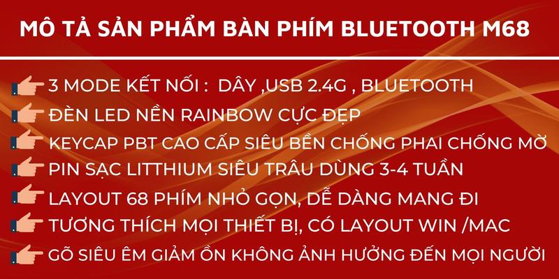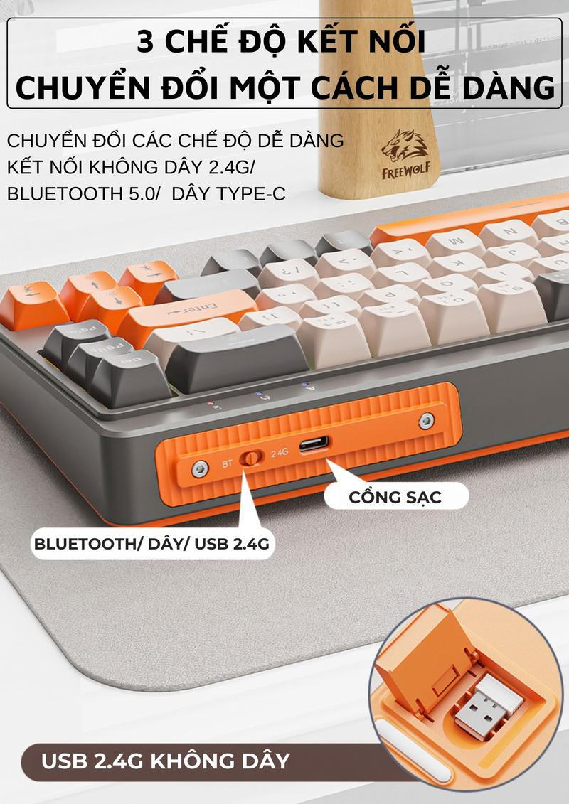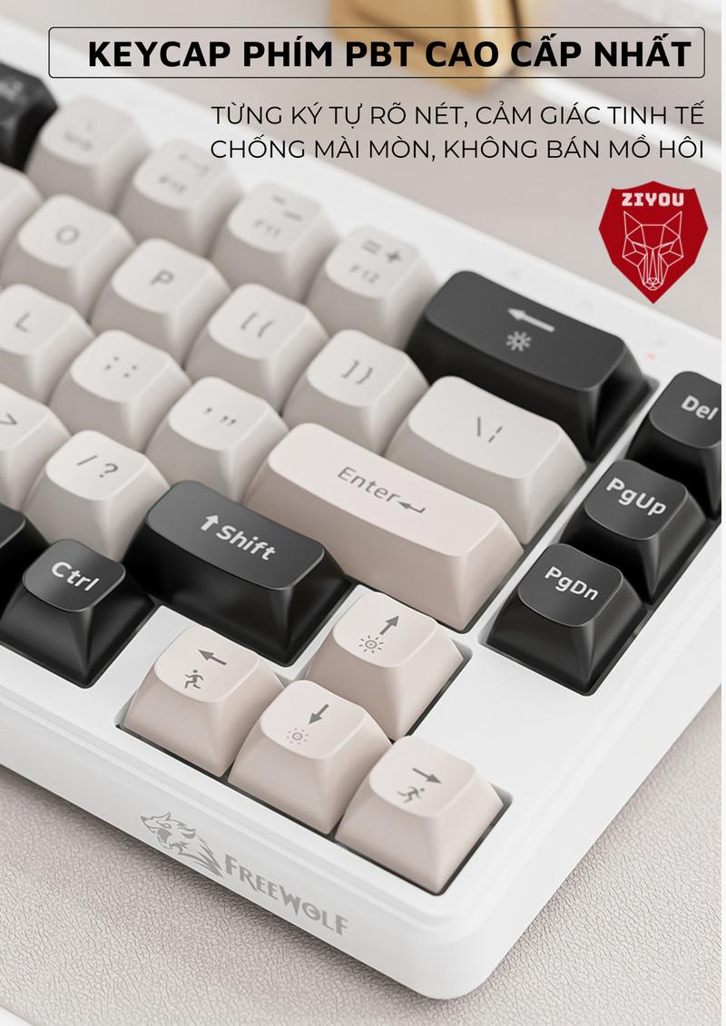 FreeWolf M68 là bàn phím không dây nhỏ gọn, thiết kế tối giản với 68 phím, phù hợp với những ai ưa thích sự tiện lợi và tính di động cao.