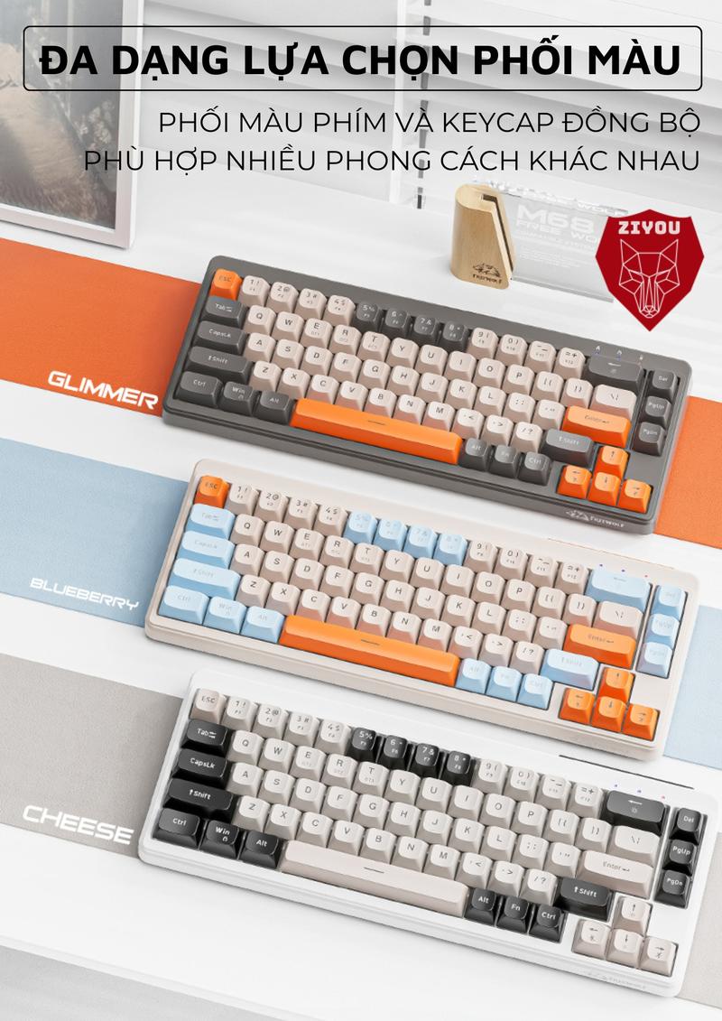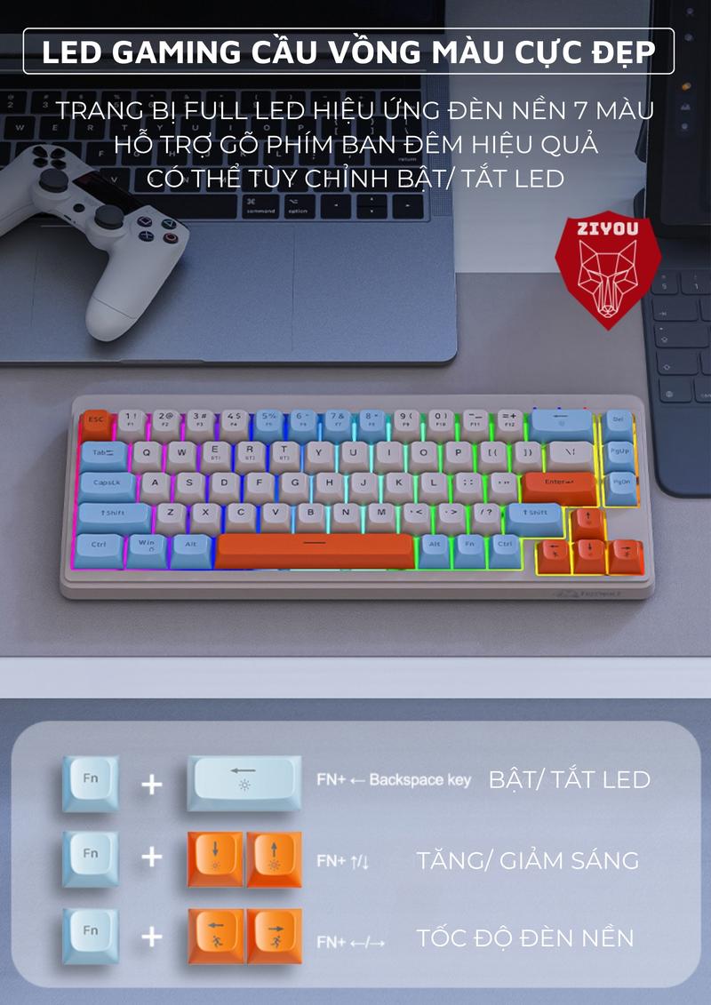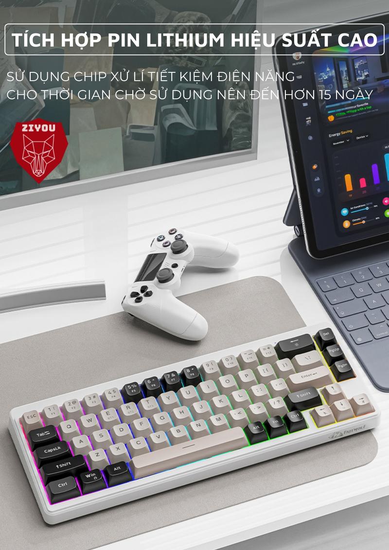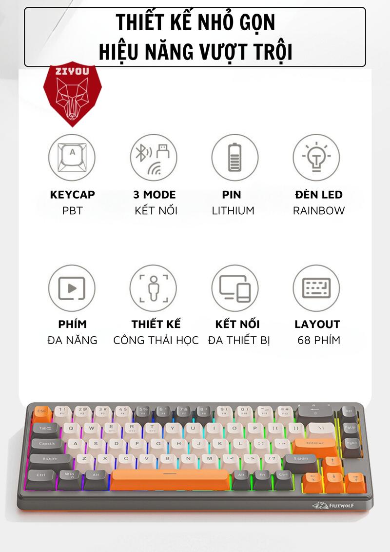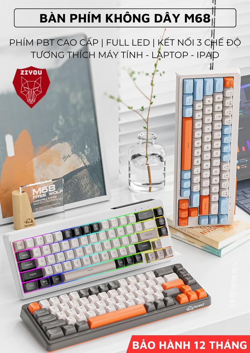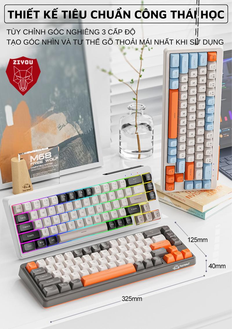 Bàn Phím MINI Không Dây Ziyou FreeWolf M68 Full LED Gõ Êm Giảm Ồn 3 Chế Độ Kết Nối Tương Thích Máy Tính, Điện Thoại
