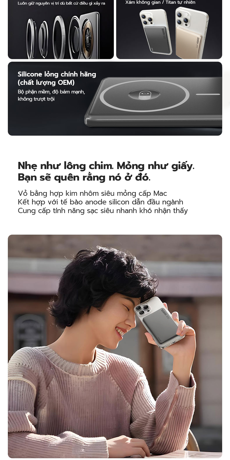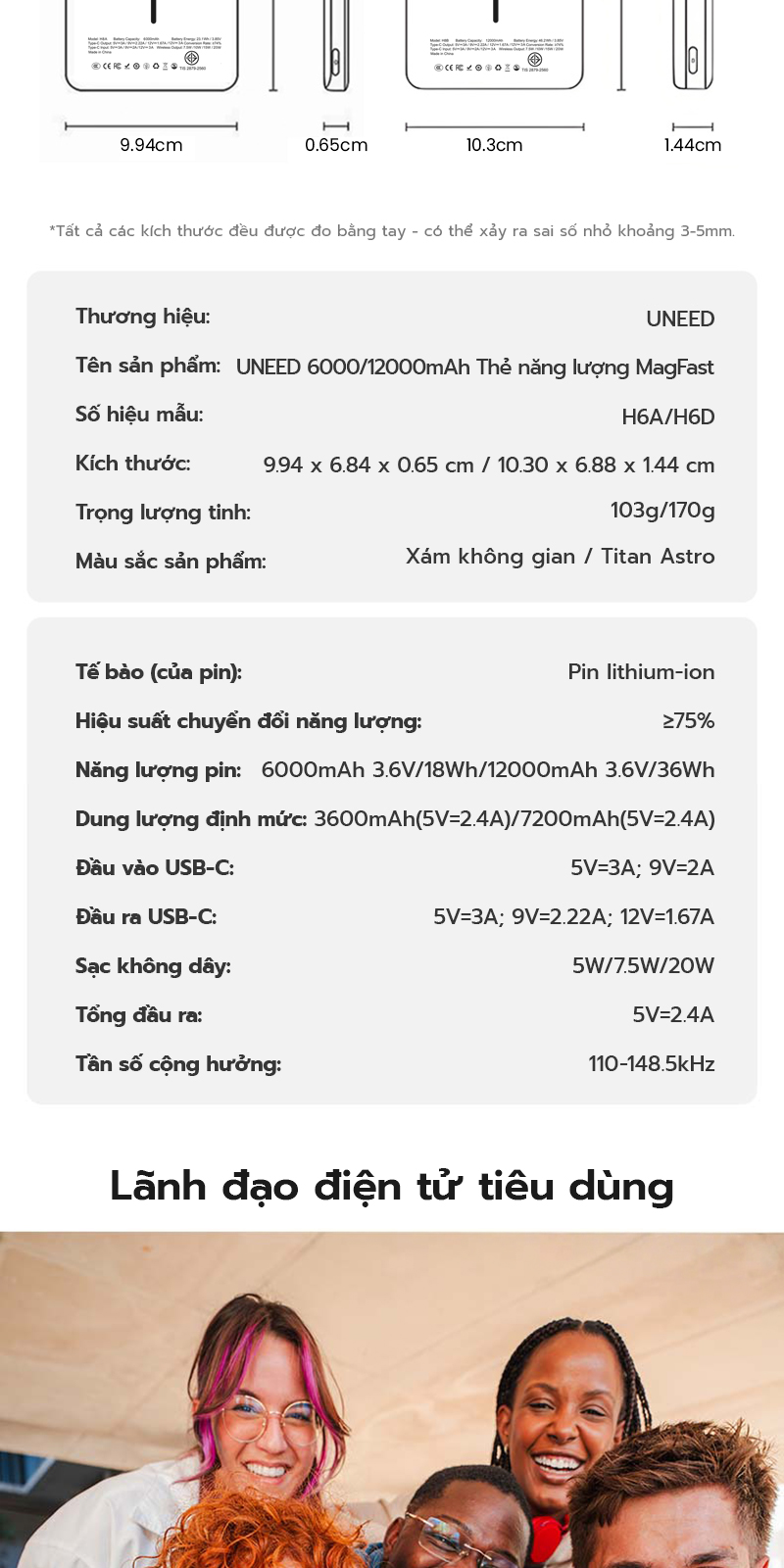 6000mAh: Kích thước 9.94×6.84×0.65cm, trọng lượng khoảng 103g