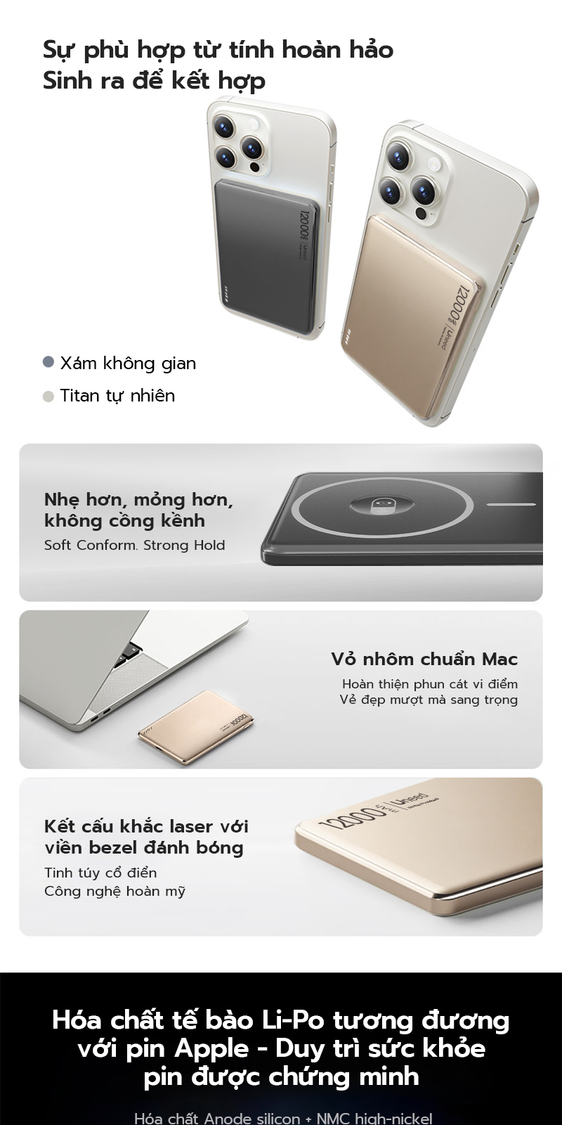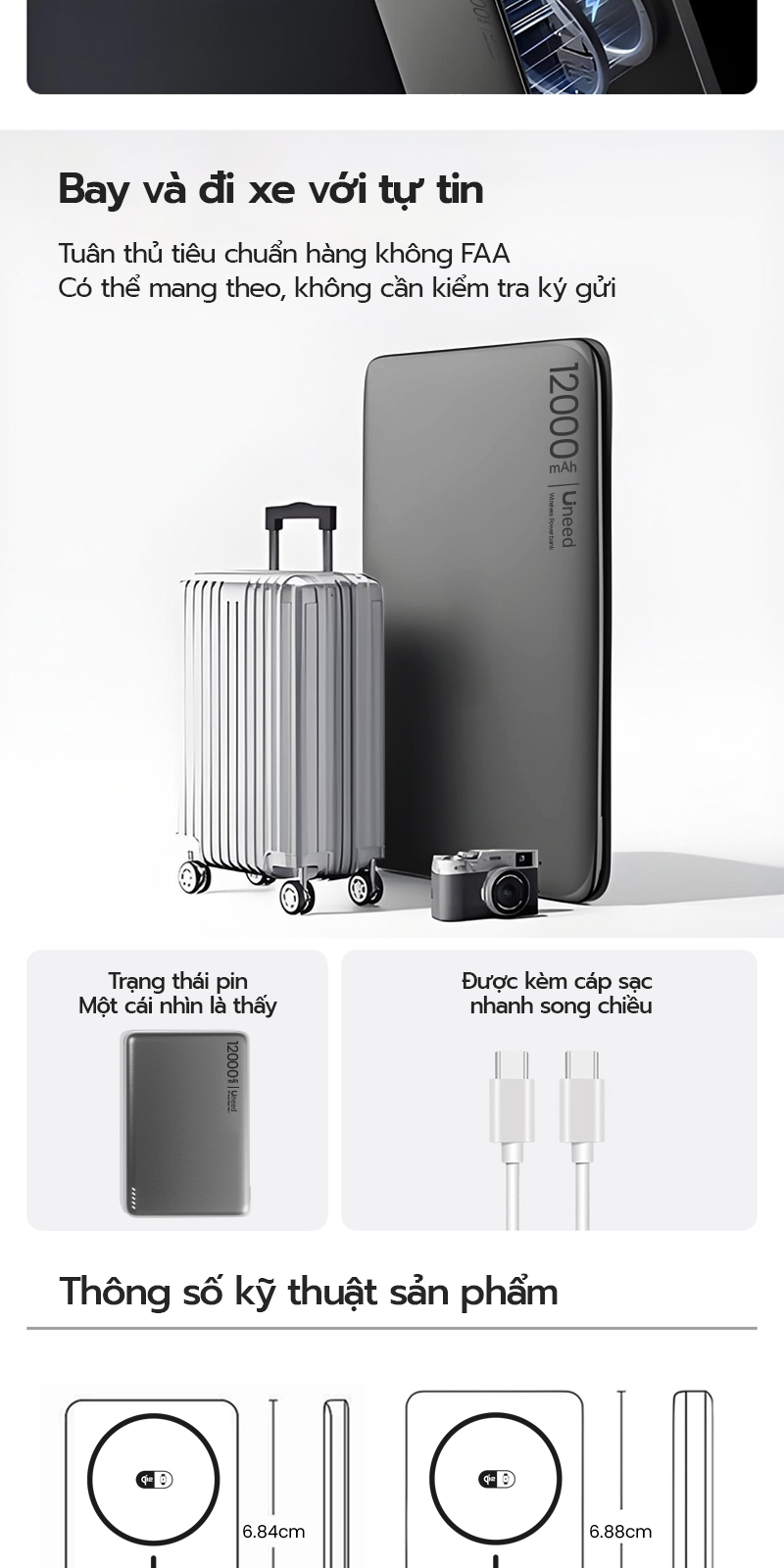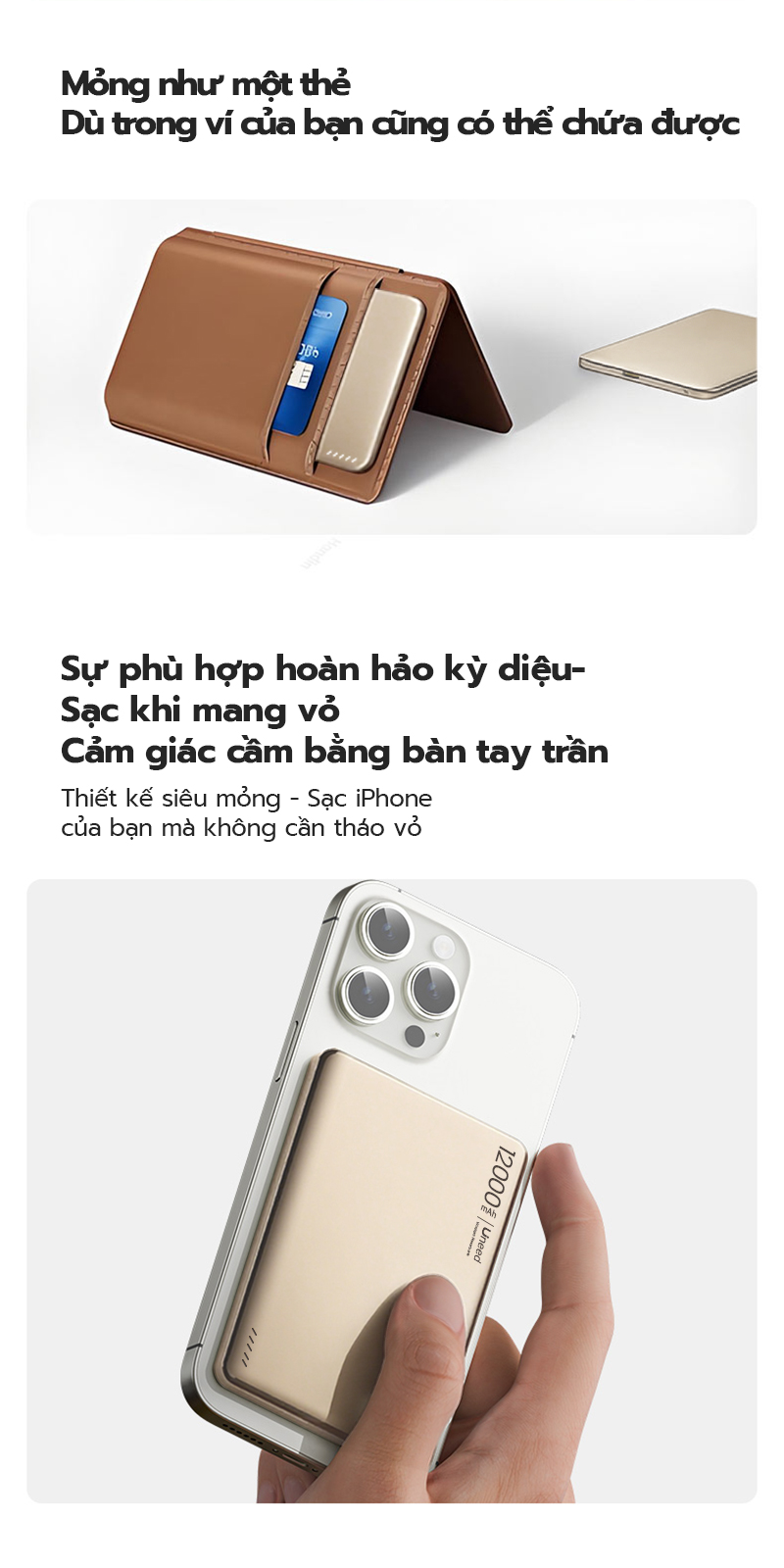 12000mAh: Kích thước 10.3×6.88×1.44cm, trọng lượng khoảng 170g