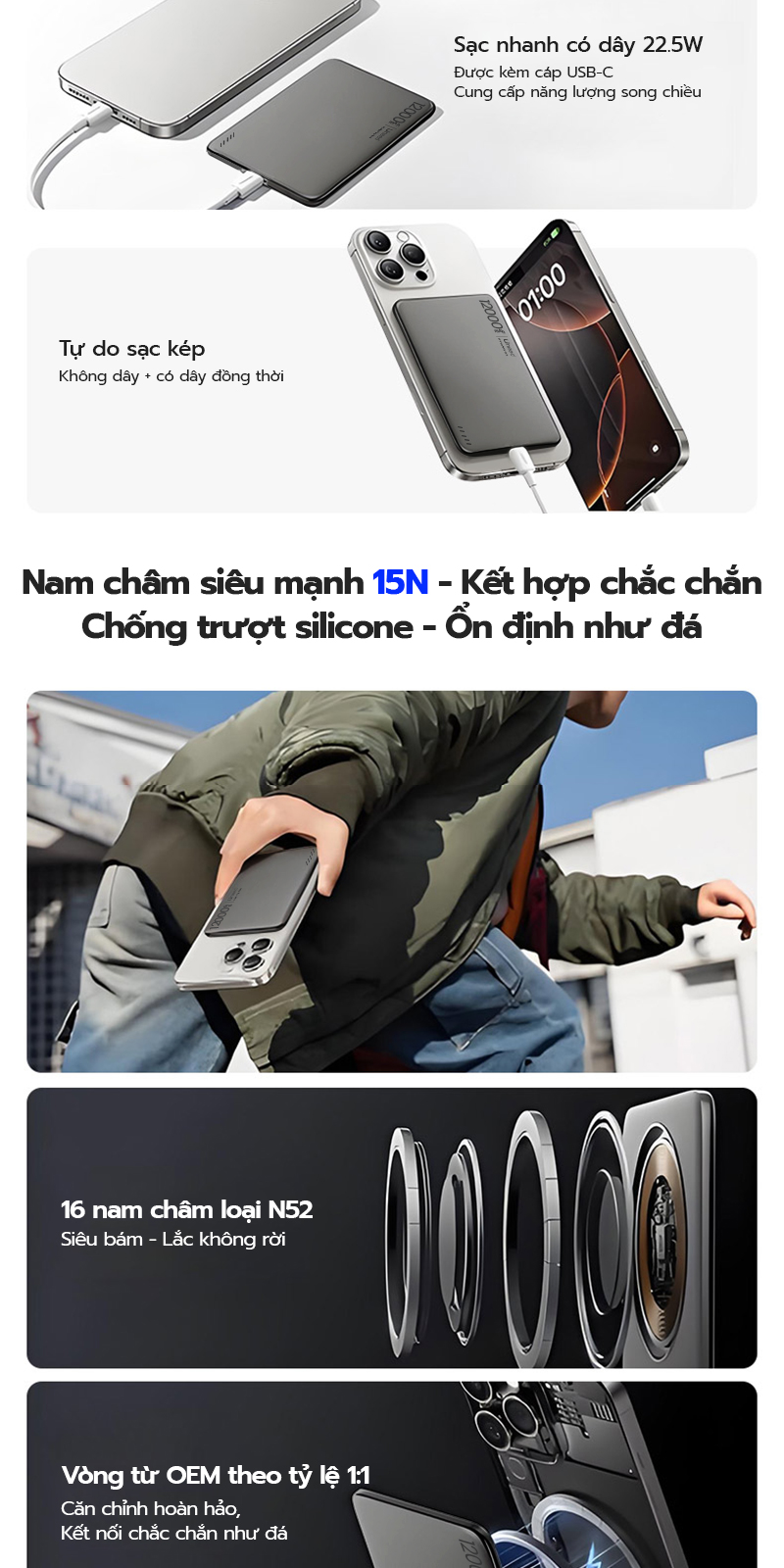 👉Công suất: Công suất đầu ra có dây 22.5W (Type-C); Công suất sạc không dây 20W