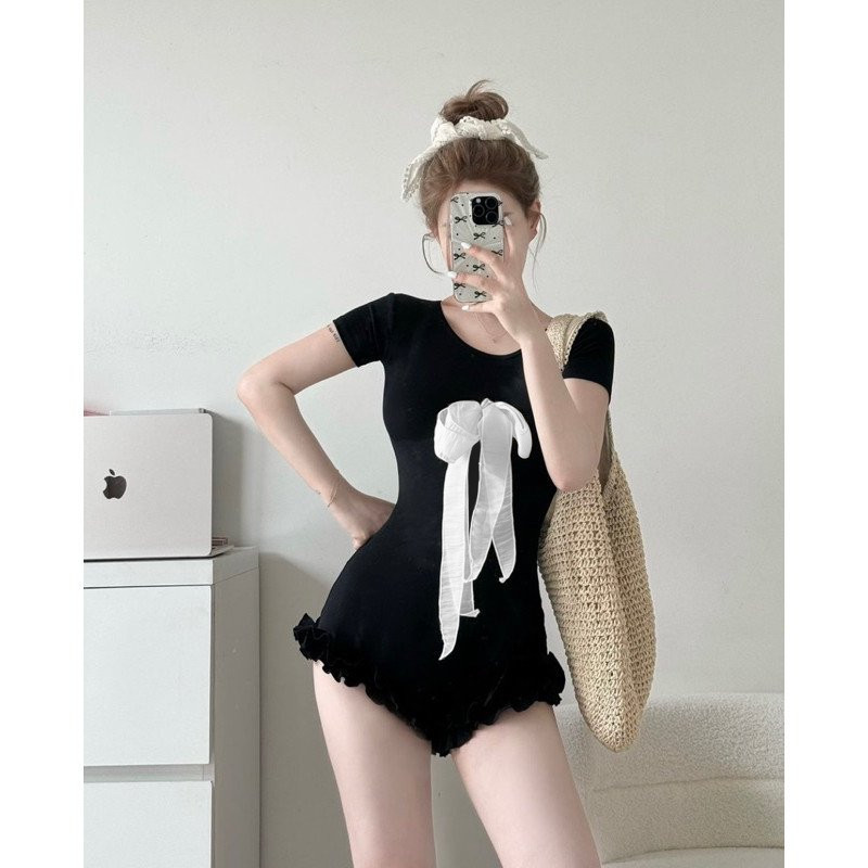 BARE_Jumsuit Bikini Bèo Nơ Ngực Tay Cộc Chất Co Dãn Thoải Mái, body suit đi biển đi chơi xinh- D053