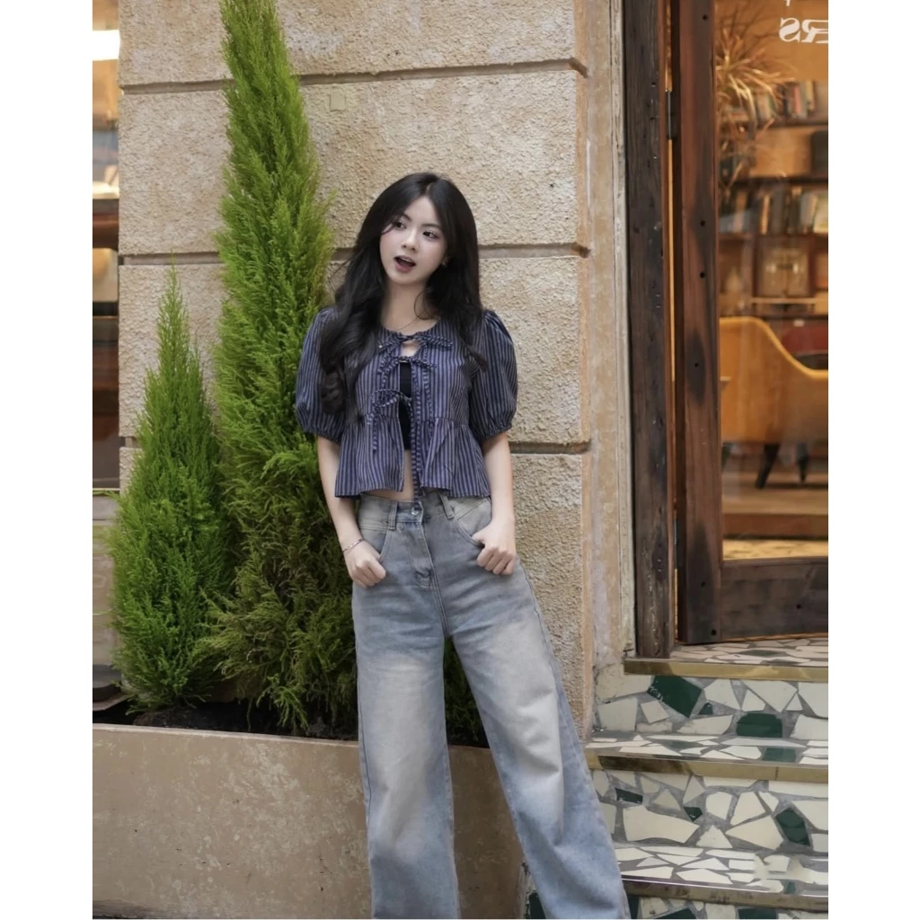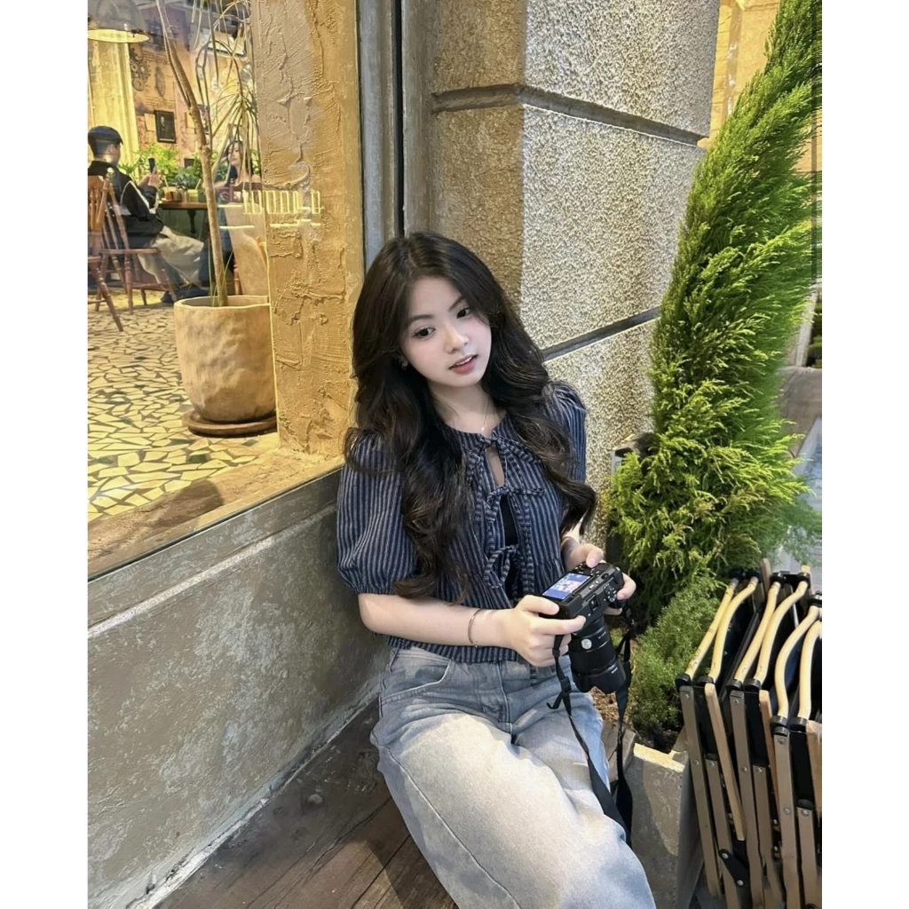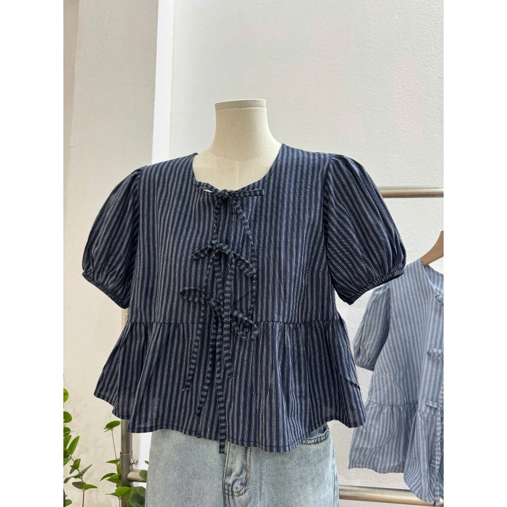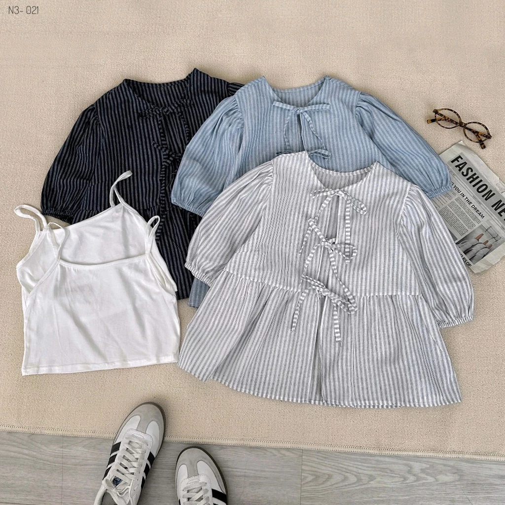 BARE_(Tặng kèm áo 2 dây) Áo Babydoll Kẻ Buộc Nơ Tay Phồng, Áo Kiểu Nữ Tay Bồng Kèm Áo 2 Dây_A523