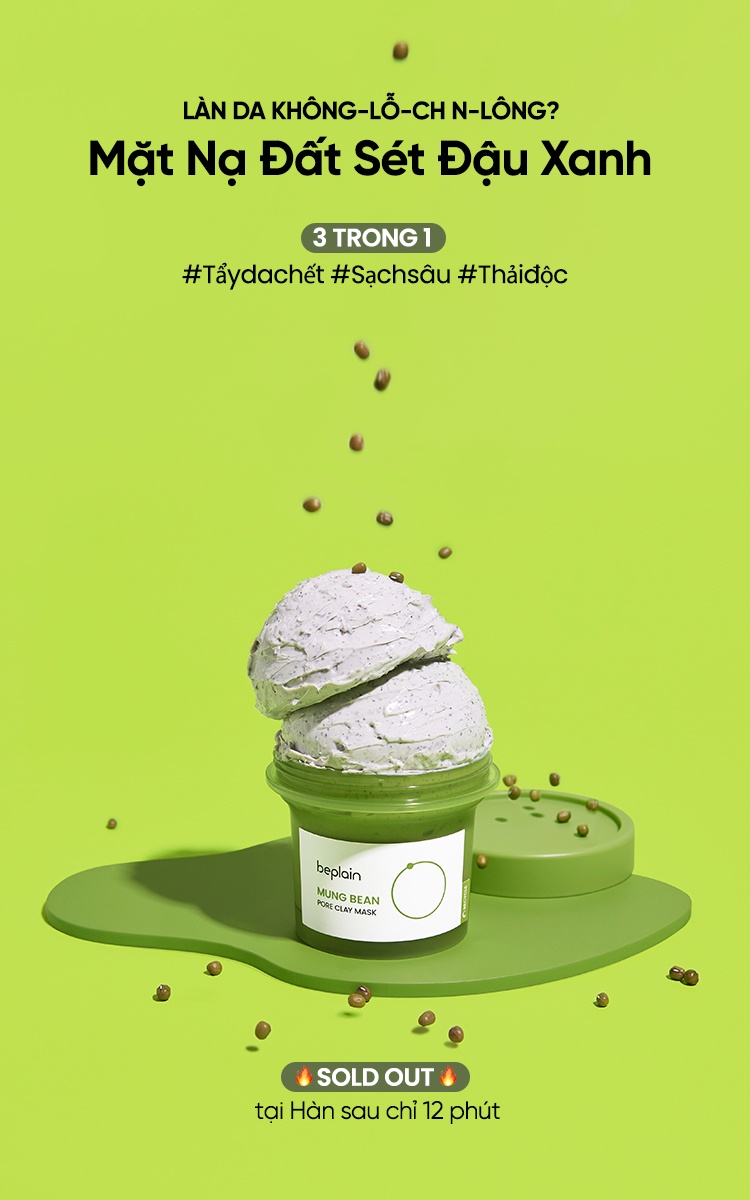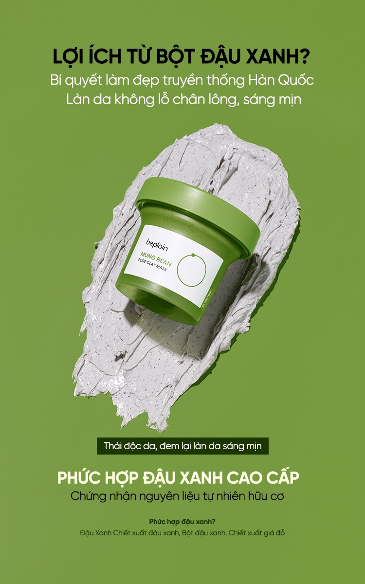 Mặt nạ đất sét với sự kết hợp của Đậu xanh nguyên chất , cùng với các hoạt chất Enzyme từ Đậu xanh cũng như bột Đậu xanh , 6 bùn khoáng tinh khiết cùng với AHA cũng như Niacinamide , giúp làm sạch. Dầu thừa , sợi bã nhờn cũng như làm sạch da chết trên bề mặt da , cải thiện mụn đầu trắng , mụn đầu đen . Với việc bổ sung Calamine cũng như Allantoin , mặt nạ đất sét beplain có kết cấu mềm mại , không làm khô da , ngược lại , nó còn bảo vệ hàng rào bảo vệ giúp làm dịu da cho làn da mịn màng ., Sáng ngay lập tức '