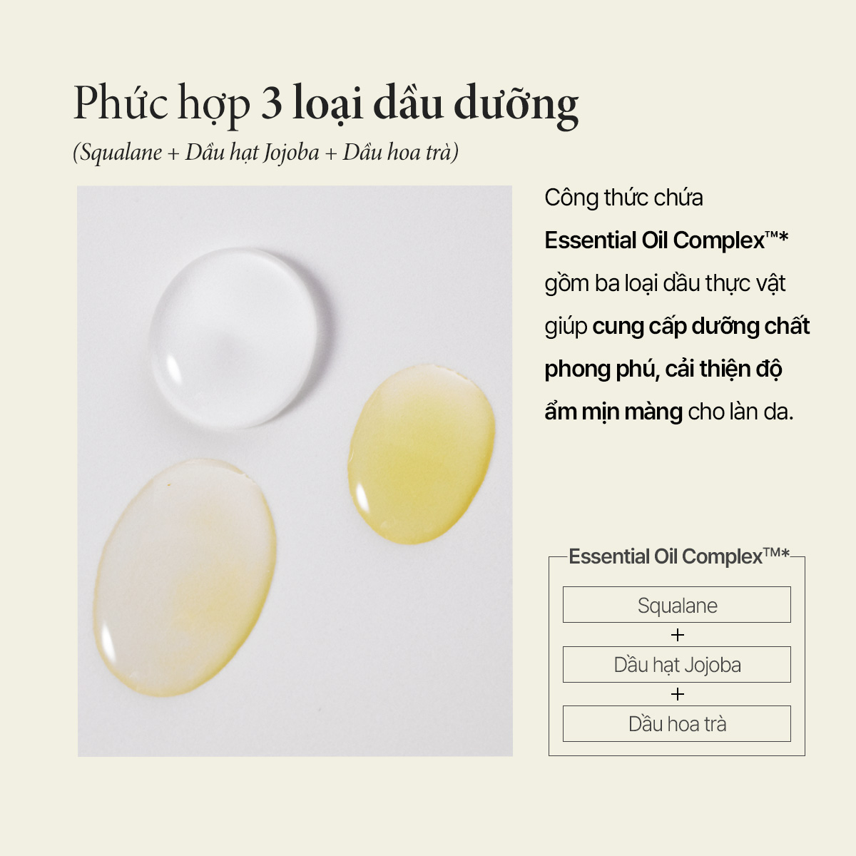 + Oil ComplexTM Squalance, Jojoba Oil, Camellia Oil: Dưỡng ẩm