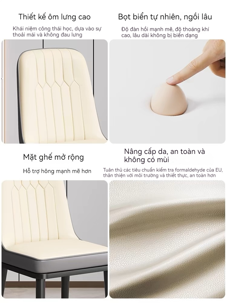 • Mặt ghế: Da PU cao cấp + xốp tái chế mềm mại, đàn hồi tốt