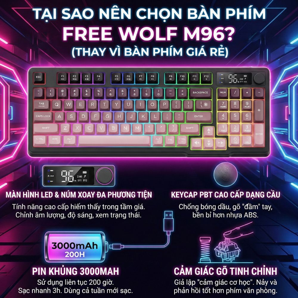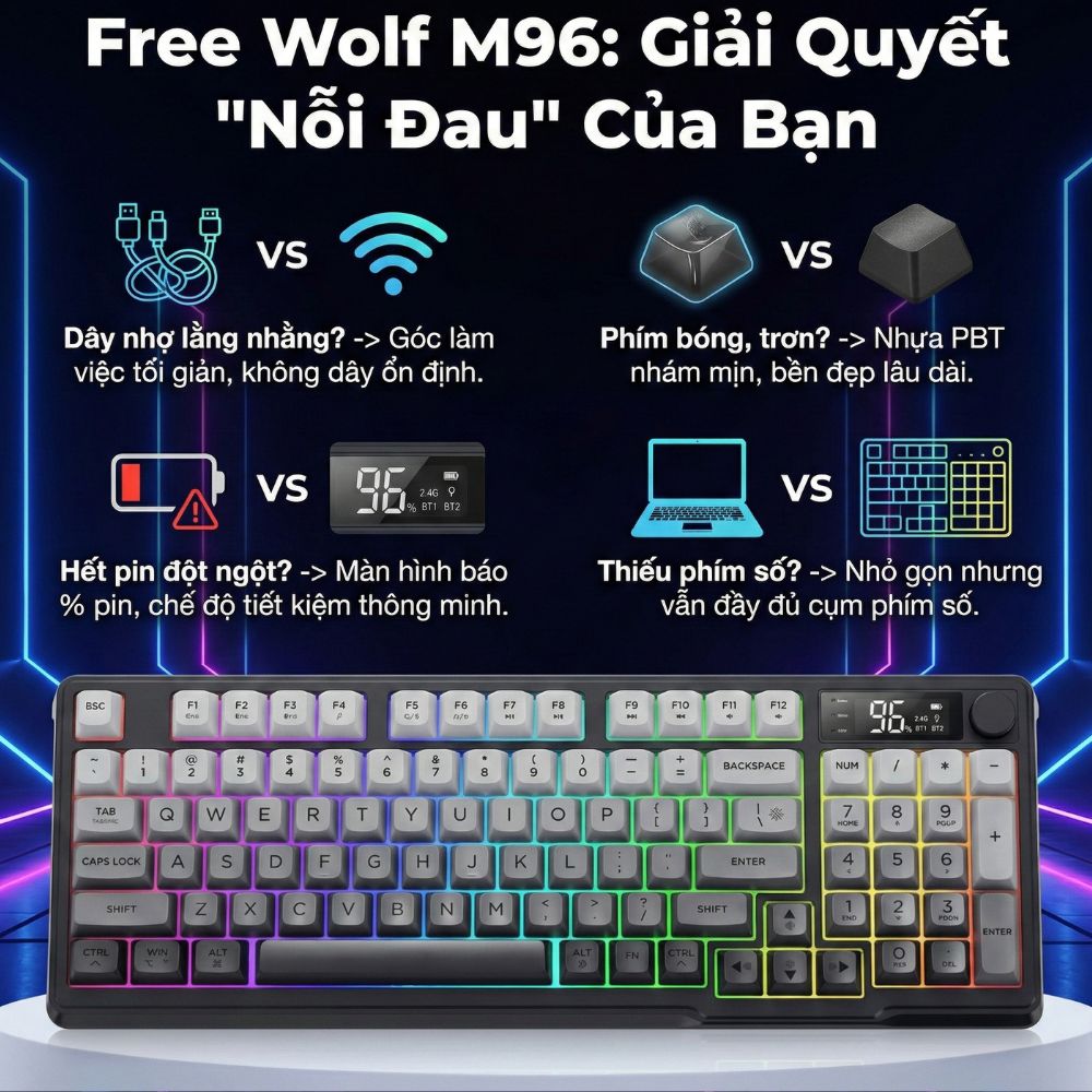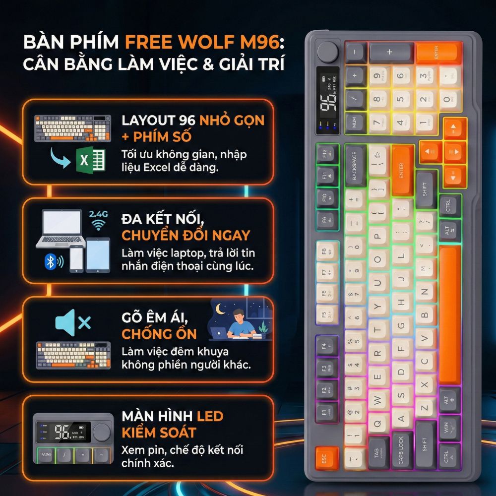 🔥 **Thiết Kế Độc Đáo và Đẳng Cấp:** Với màn hình hiển thị thông tin đầy đủ hoạt động của bàn phím và chất liệu nhựa PBT cao cấp chống bám dầu, mồ hôi, Freewolf M96 không chỉ là công cụ làm việc mà còn là biểu tượng phong cách trong không gian làm việc của bạn.