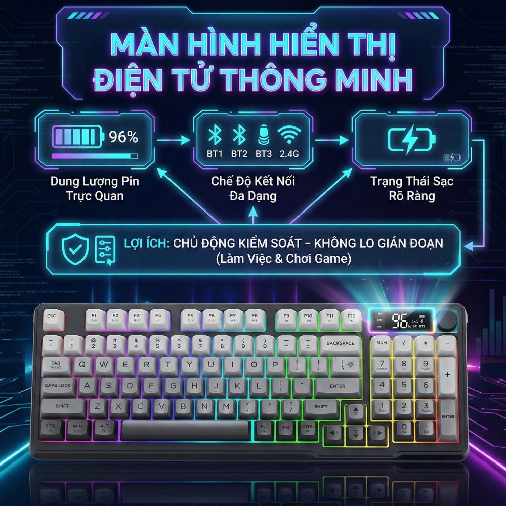 Bộ Bàn Phím Không Dây Bluetooth M96 LED 7 Màu Có Màn Hình, 2 Mode, Phím PBT Cao Cấp, Gõ Êm Chống Ồn