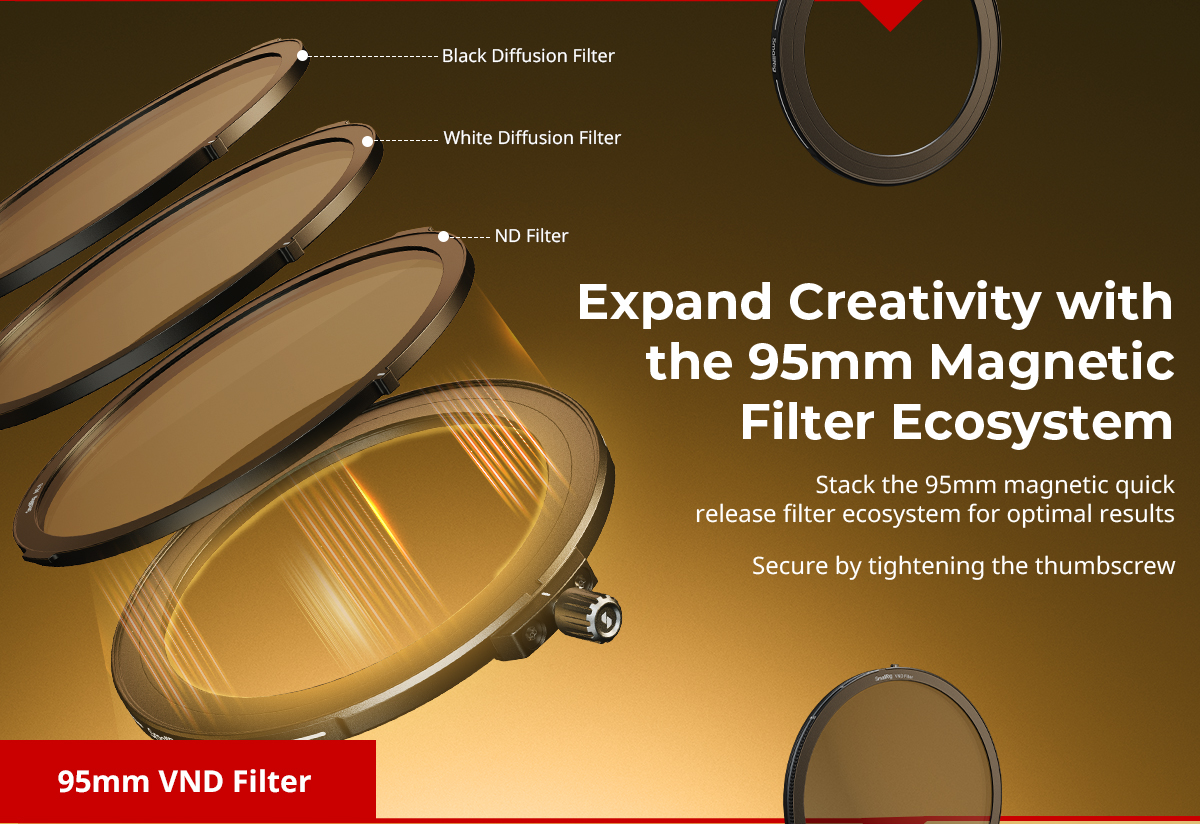 Bộ lọc VND cung cấp phạm vi điều chỉnh 2-9 điểm dừng linh hoạt. Nó cũng có lớp phủ 22 lớp hai mặt sử dụng kính B270 nhập khẩu và kết hợp màng phân cực siêu mỏng và lớp liên kết quang học, mang lại độ lệch màu cực thấp 1-6 stop. Hơn nữa, bộ lọc VND này có thể thay thế cho bộ lọc ND một mảnh truyền thống, sử dụng công nghệ giới hạn ánh sáng tiên tiến để loại bỏ mẫu X. Bộ lọc VND tự hào có độ phân giải 8K, cho phép ghi định dạng RAW 8K.