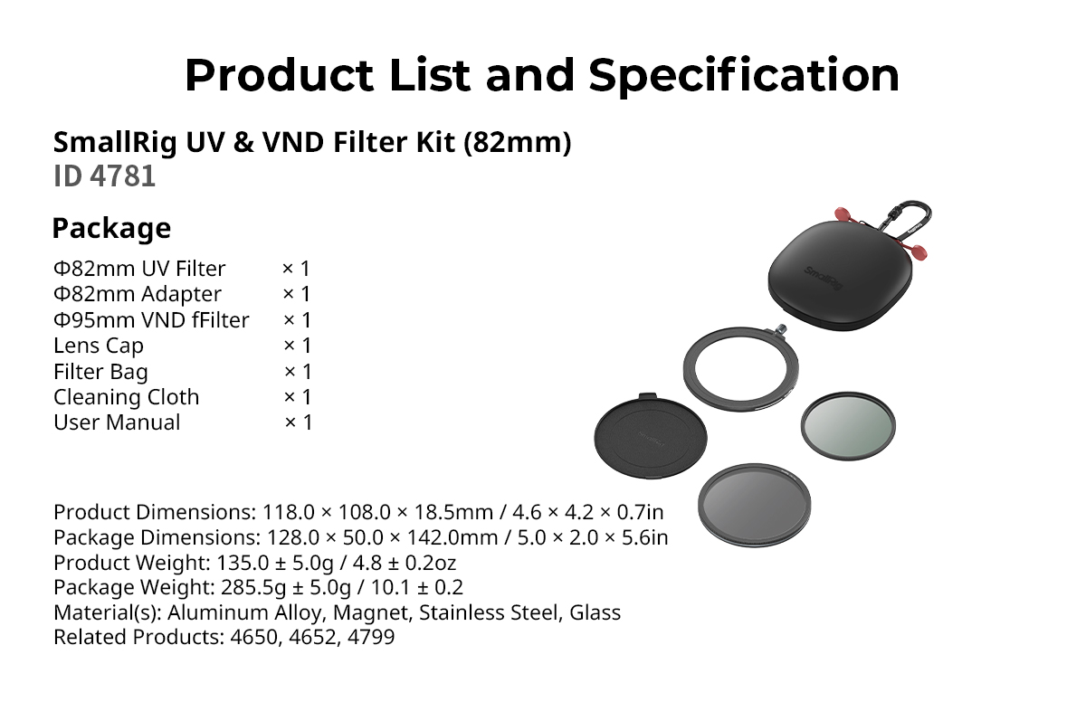 Tên sản phẩm trong gói: Bộ lọc UV & VND SmallRig 82mm 4781