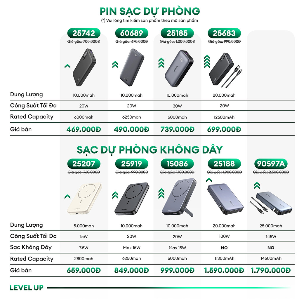 - 25188 - 20000mAh - Đầu ra từng cổng USB-A 22.5W + USB-C1 100W + USB-C2 30W - Đầu vào USB-C1 65W - Màn hình LED - Kèm cáp USB-C to USB-C 100W