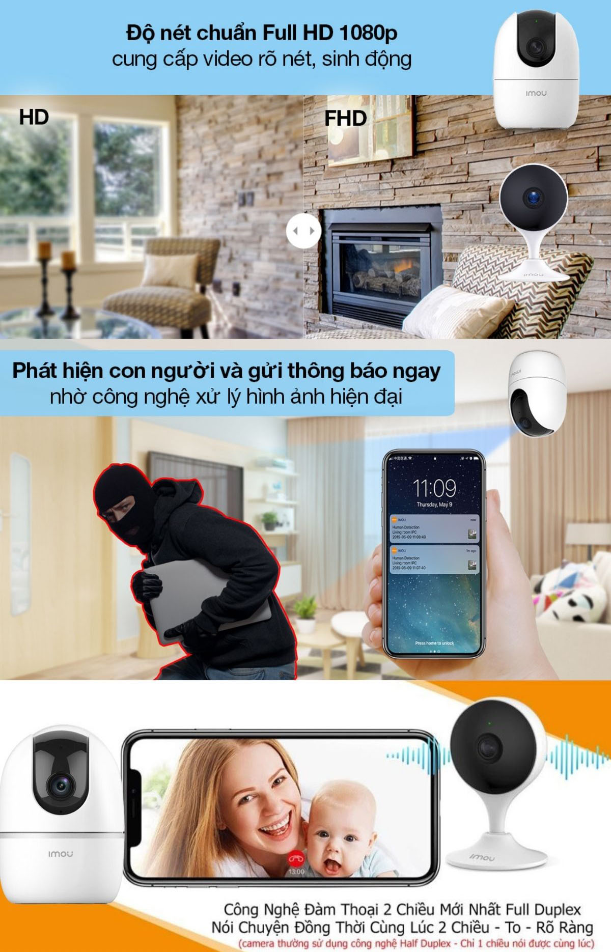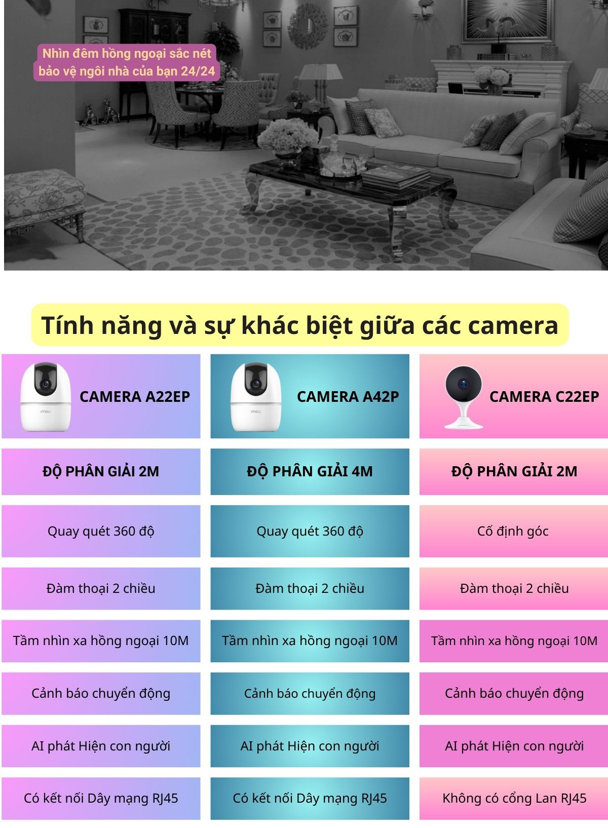 - Phát hiện chuyển động, âm thanh, con người, theo dõi thông minh