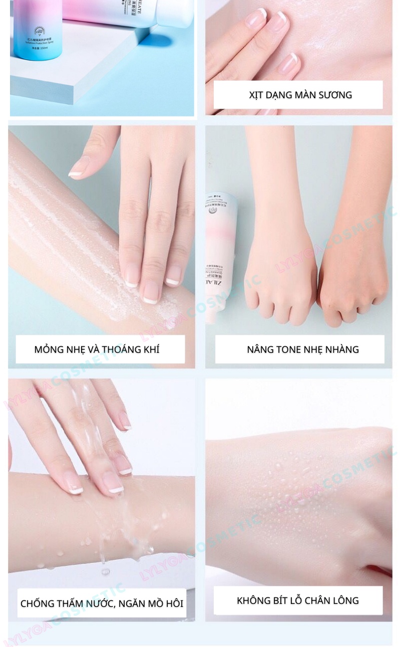 Chống nắng dạng xịt phun sương (mist), khi xịt ra sẽ thấy dung dịch rất lỏng màu trong suốt, không bết dính, dễ dàng thẩm thấu trên bề mặt da.