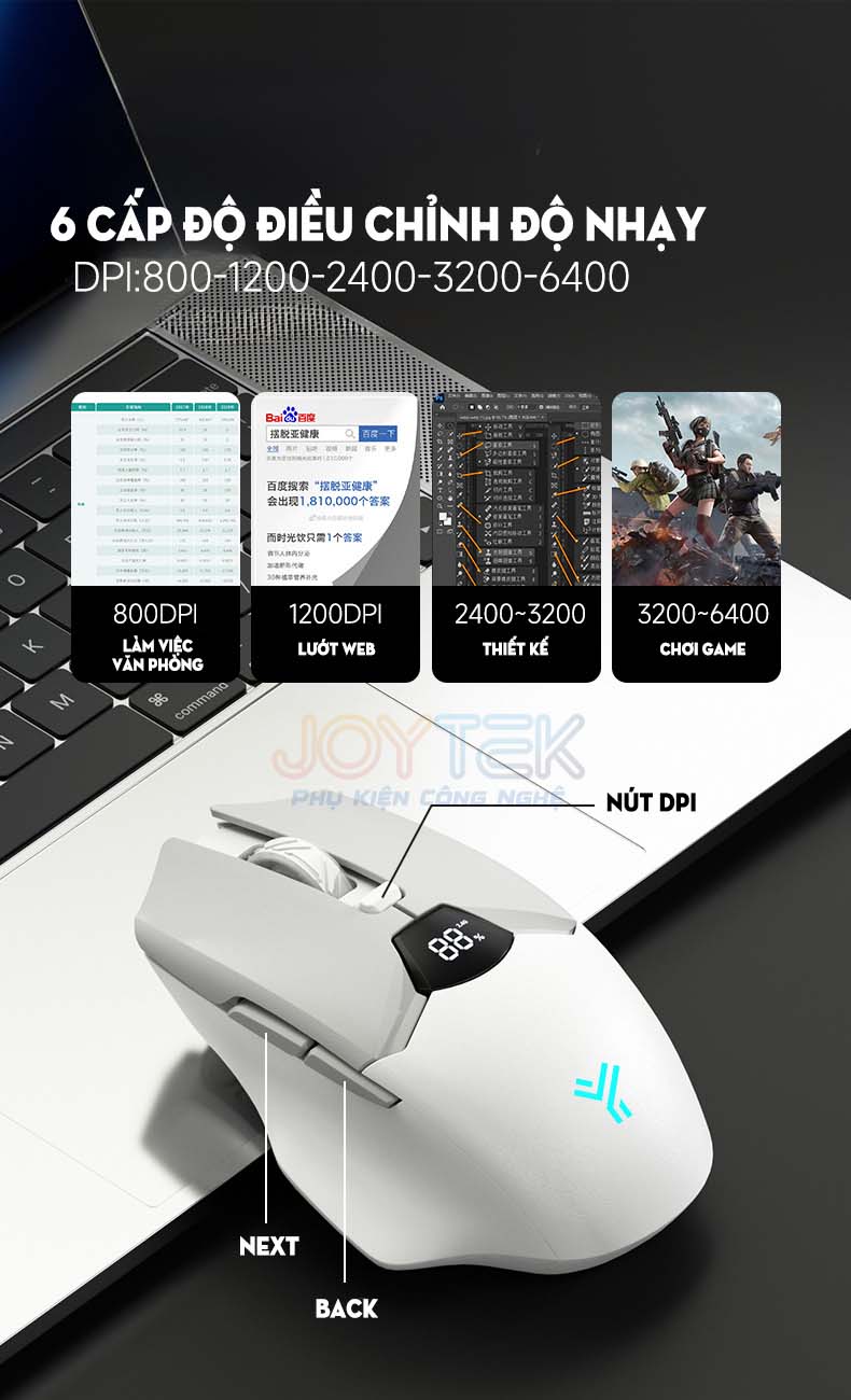 ✅ Độ chính xác vượt trội – Trang bị 6 mức DPI tùy chỉnh từ 800 đến 6400 giúp thao tác chính xác, phản xạ nhanh trong mọi tựa game FPS, MOBA hay làm việc đồ họa.