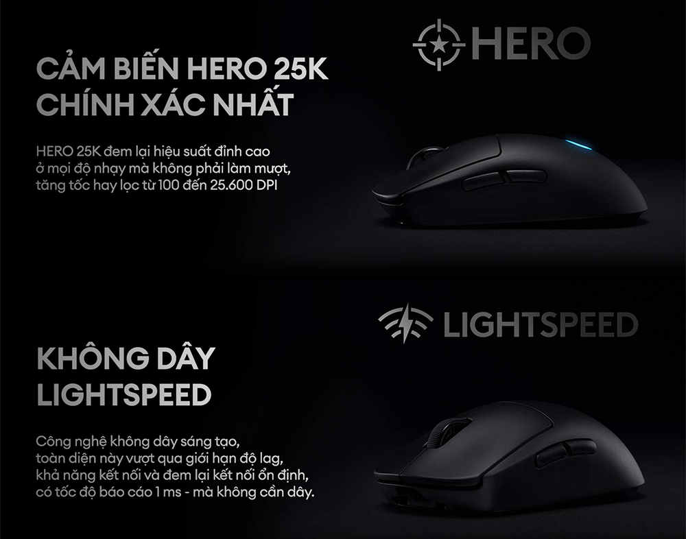 Vì các chuyên gia thể thao điện tử luôn cố gắng để đạt được tốc độ và độ chính xác cao nhất, Logitech G cũng vậy. Với phát minh là HERO 25K, cảm biến chơi game thế hệ tiếp theo, giờ đây thế giới đã có nhà tiên phong mới. Đối với chuột không dây PRO, HERO 25K đã được tối ưu hóa để theo dõi các cú nhấp chuột ở tốc độ hơn 400 IPS mà không phải xoay chuyển. HERO 25K đem lại hiệu suất đỉnh cao ở mọi độ nhạy mà không phải làm mượt, tăng tốc hay lọc từ 100 đến 16.000 DPI. HERO 25K cũng tiêu thụ năng lượng ít hơn 10 lần so với những con chuột tiền nhiệm, như PMW3366, cho phép pin nhẹ hơn và tuổi thọ pin dài hơn. Các chuyên gia đòi hỏi điều tốt nhất, và đó là HERO 25k.