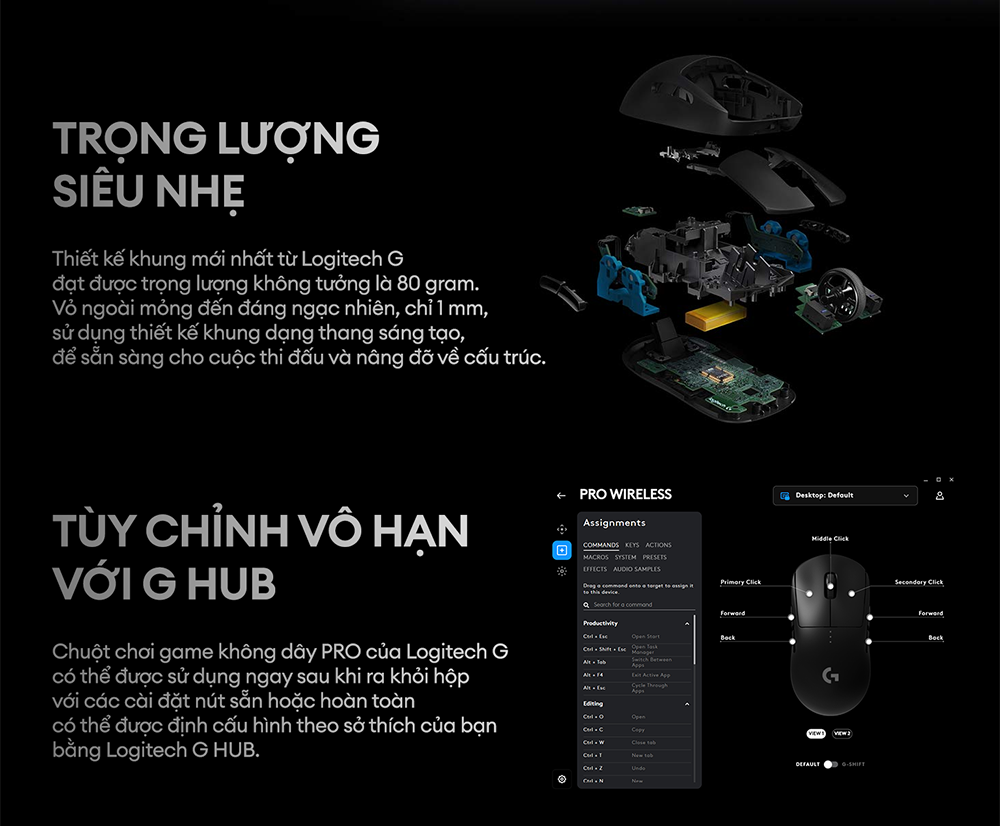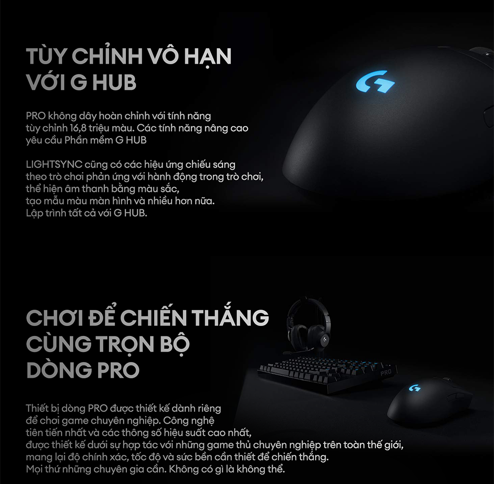 PRO không dây hoàn chỉnh với tính năng tùy chỉnh 16,8 triệu màu2Các tính năng nâng cao yêu cầu Phần mềm Chơi game của Loitech, có sẵn để tải về tại logitechG.com/downloads hoàn hảo để thể hiện màu sắc của đội bạn, cá nhân hóa môi trường hoặc đồng bộ với các sản phẩm G khác.