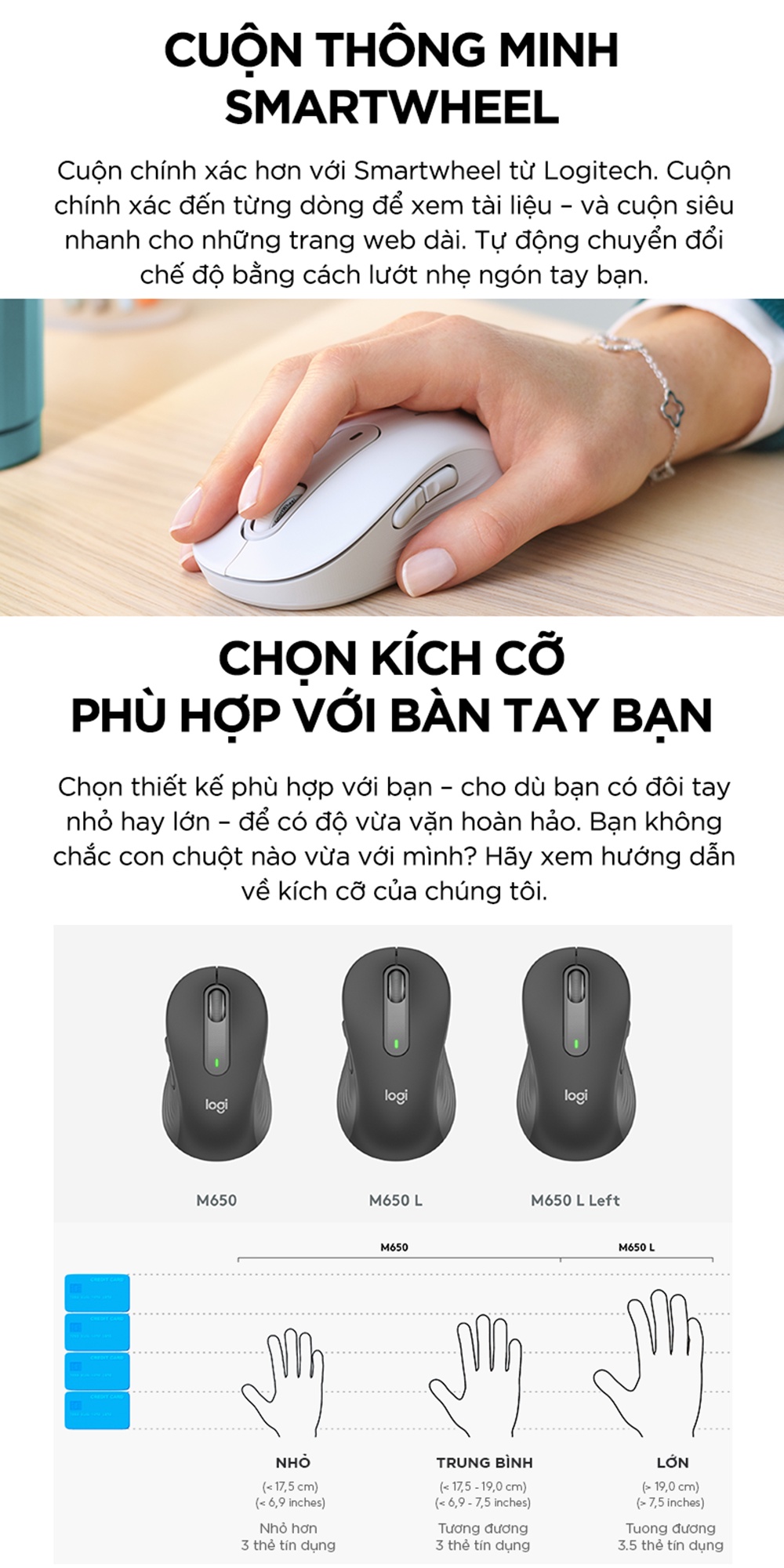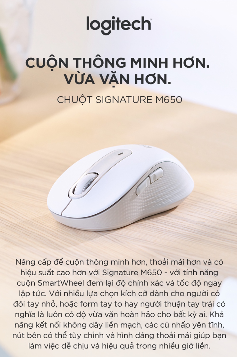 Chuột không dây bluetooth Logitech Signature M650 - SmartWheel, giảm ồn, tùy chỉnh các nút