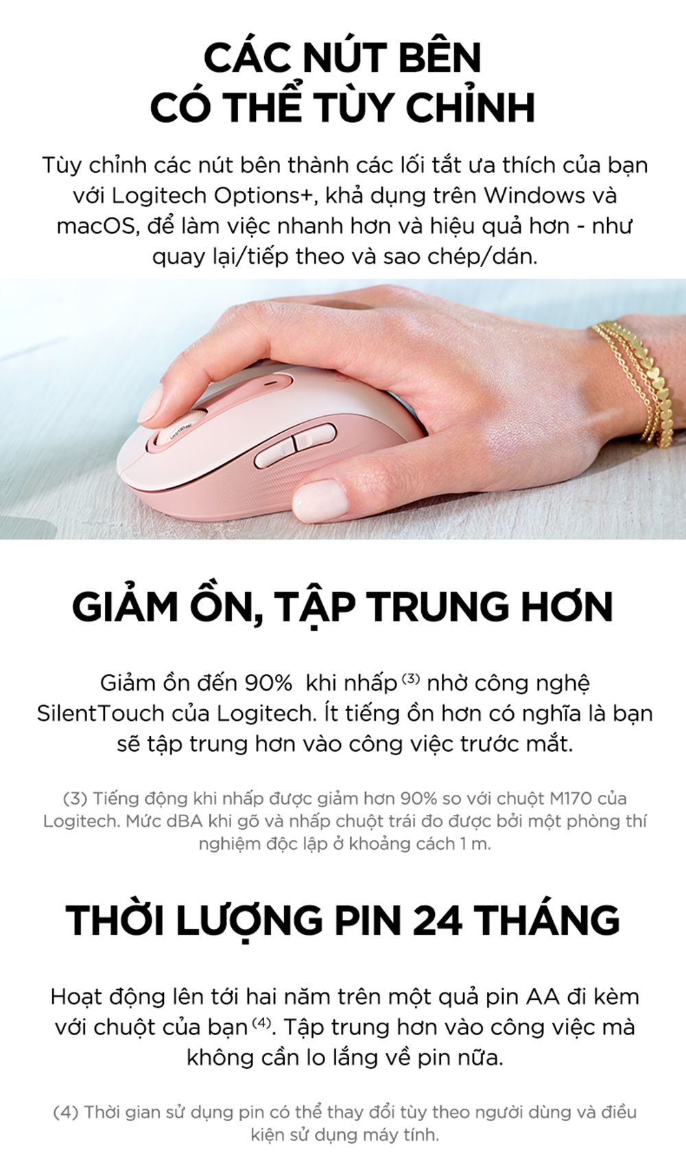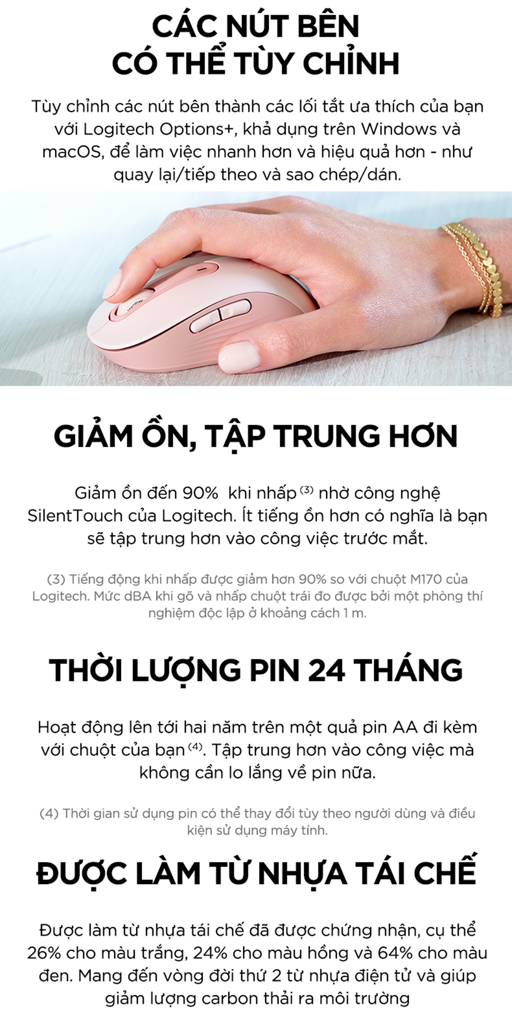 Các tính năng linh hoạt của chuột bao gồm cuộn SmartWheel đem lại độ chính xác từng dòng và tự động chuyển sang chế độ lăn tự do siêu nhanh với cú lướt nhẹ của ngón tay. Với nhiều lựa chọn kích cỡ dành cho người có đôi tay nhỏ, hoặc form tay to hay người thuận tay trái có nghĩa là luôn có độ vừa vặn hoàn hảo cho bất kỳ ai. Khả năng kết nối không dây liền mạch, nút bên có thể tùy chỉnh và hình dáng thoải mái giúp bạn làm việc dễ chịu và hiệu quả trong nhiều giờ liền. Công nghệ SilentTouch của Logitech đem lại các cú nhấp yên tĩnh để giúp bạn tập trung - trong khi thời lượng pin 24 tháng** và tính tương thích phổ dụng trên nhiều hệ điều hành đảm bảo hiệu suất cao dễ dàng.
