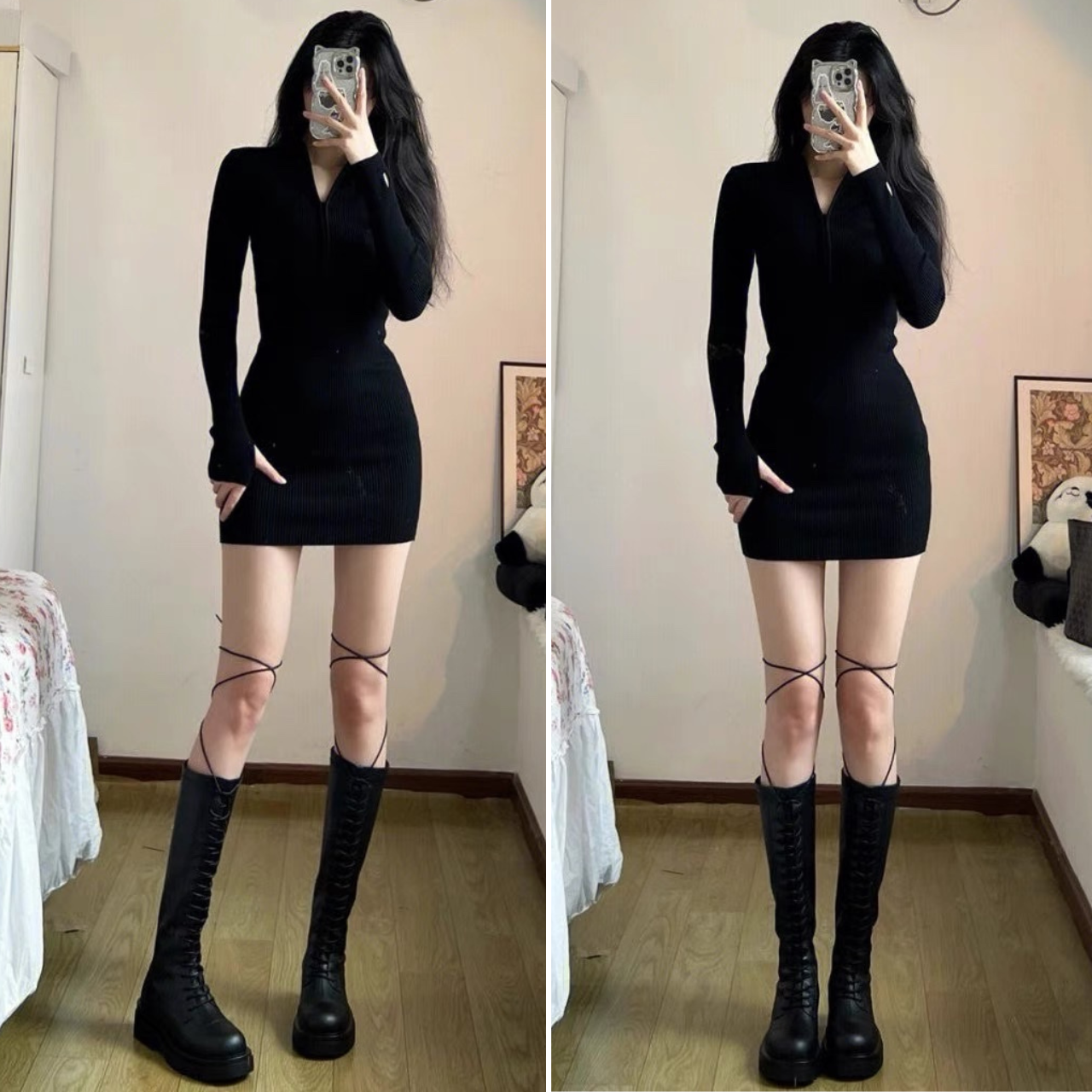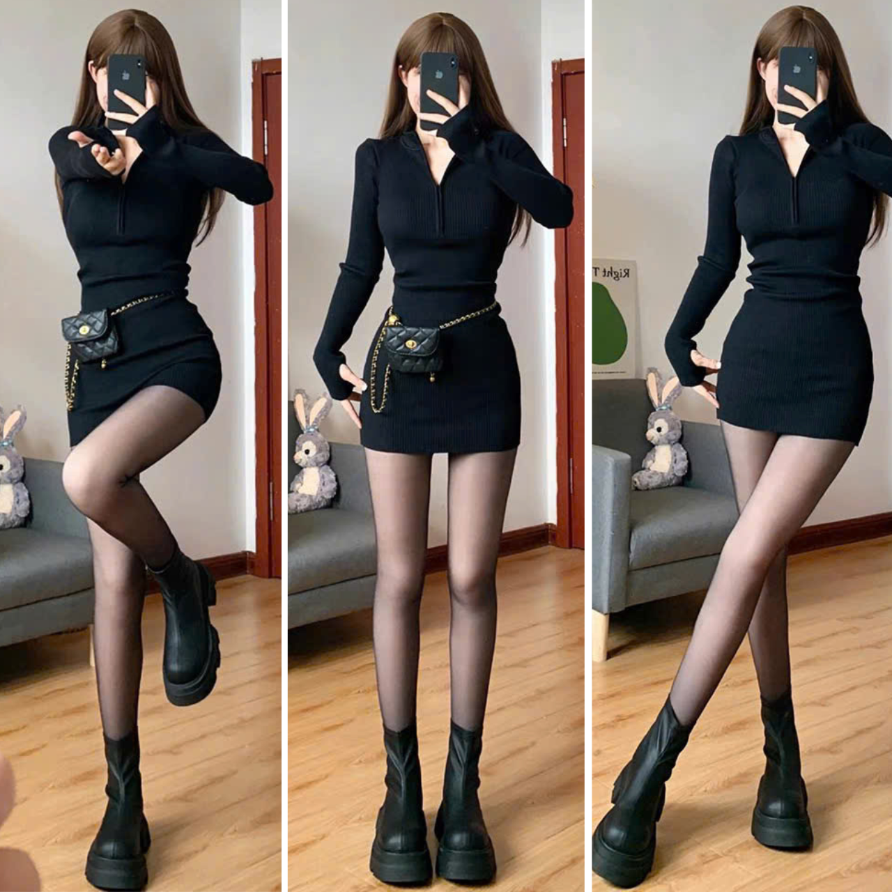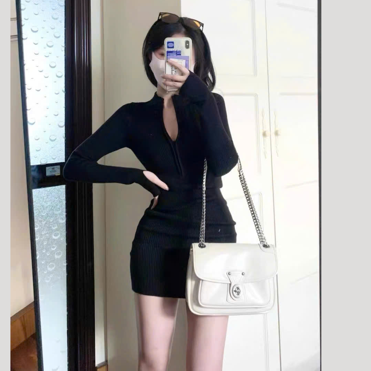Đầm body tay dài kéo khóa trước ngực màu đen chất thun co giãn mặc thoải mái tôn dáng sexy quyến rũ