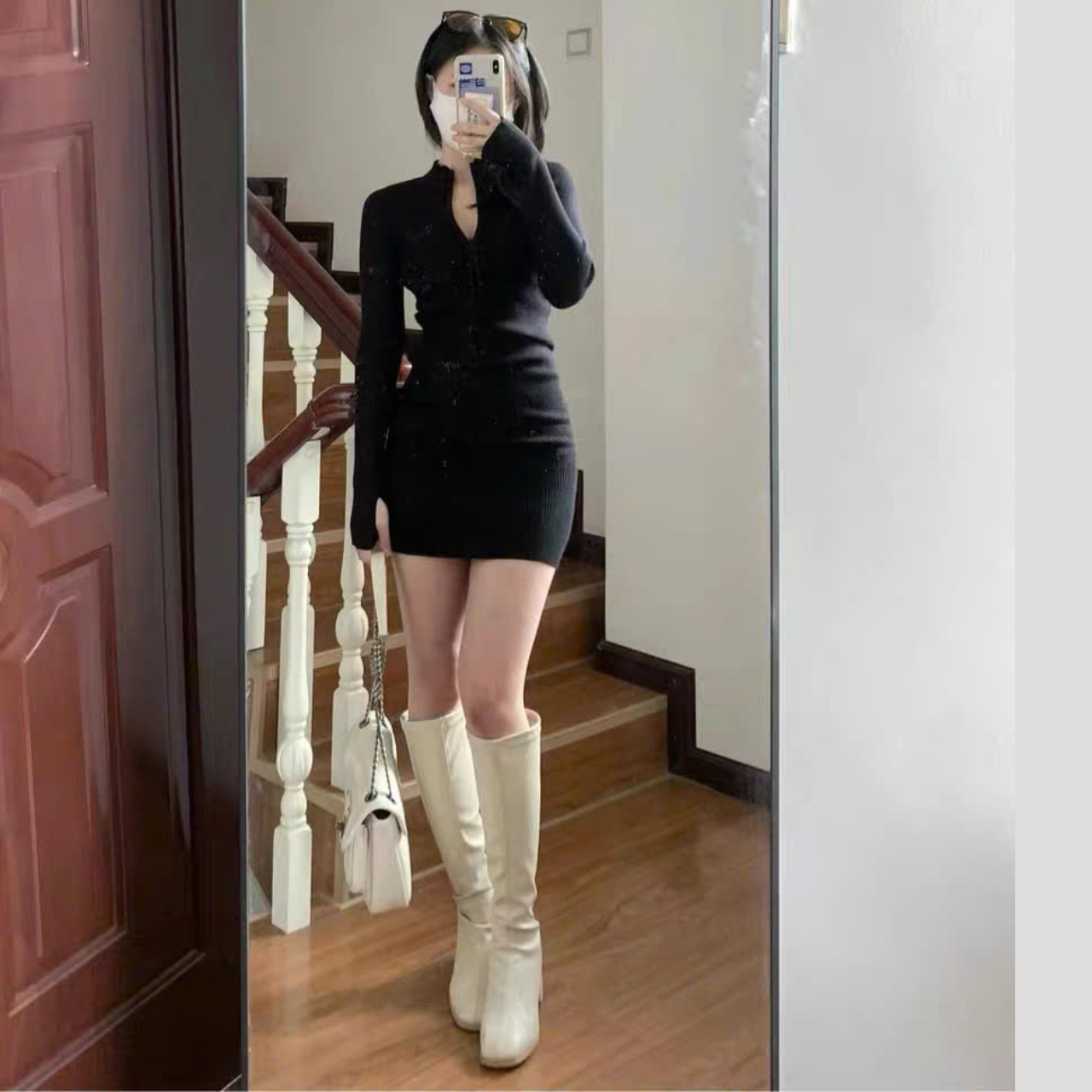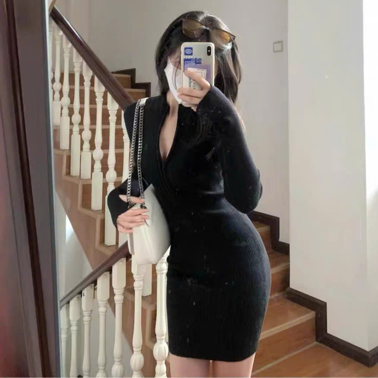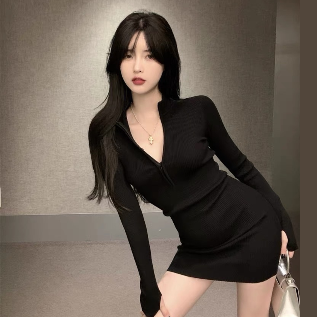 Đầm body tay dài kéo khóa trước ngực màu đen chất thun co giãn mặc thoải mái tôn dáng sexy quyến rũ