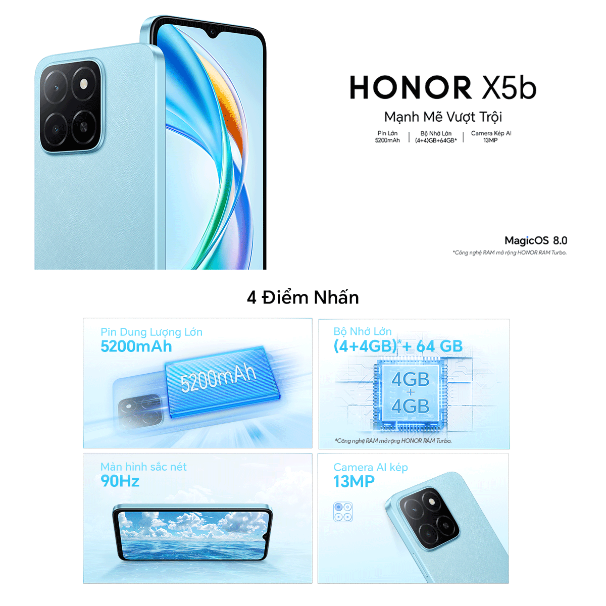 Điện thoại Honor X5b (4+4)GB+64GB | Pin 5200mAh 90Hz | Màn hình 6.56" | BH 18 Tháng Hàng Chính Hãng