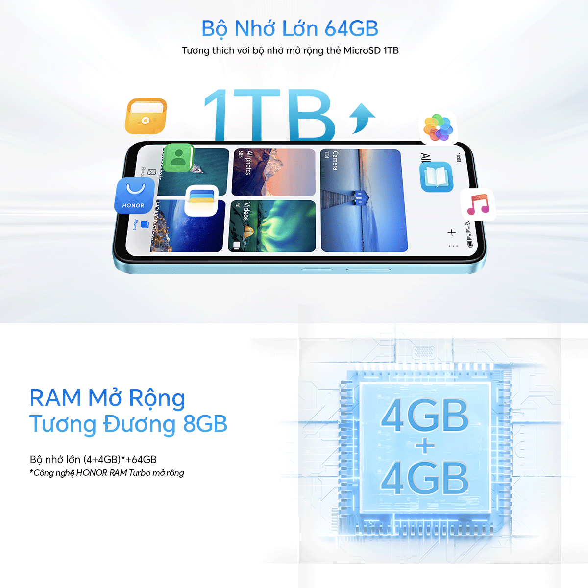 7. Thông qua công nghệ HONOR RAM Turbo, RAM 4GB được mở rộng thành 8GB. Trải nghiệm thực tế của bạn có thể khác nhau do các yếu tố khác nhau như môi trường mạng, tình huống sử dụng và thói quen sử dụng cá nhân.
