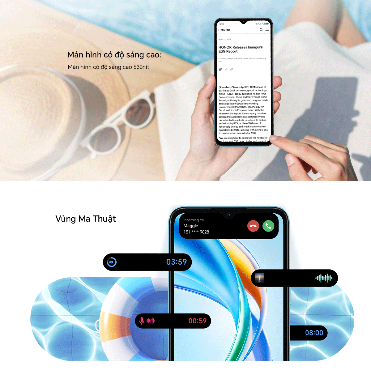 11. Dữ liệu từ Phòng thí nghiệm HONOR. Khi chế độ HBM được kích hoạt, độ sáng của một số cảnh có thể đạt tới 530nits và chế độ HBM sẽ tự động tắt khi nhiệt độ trên bàn của điện thoại vượt quá 37°C.