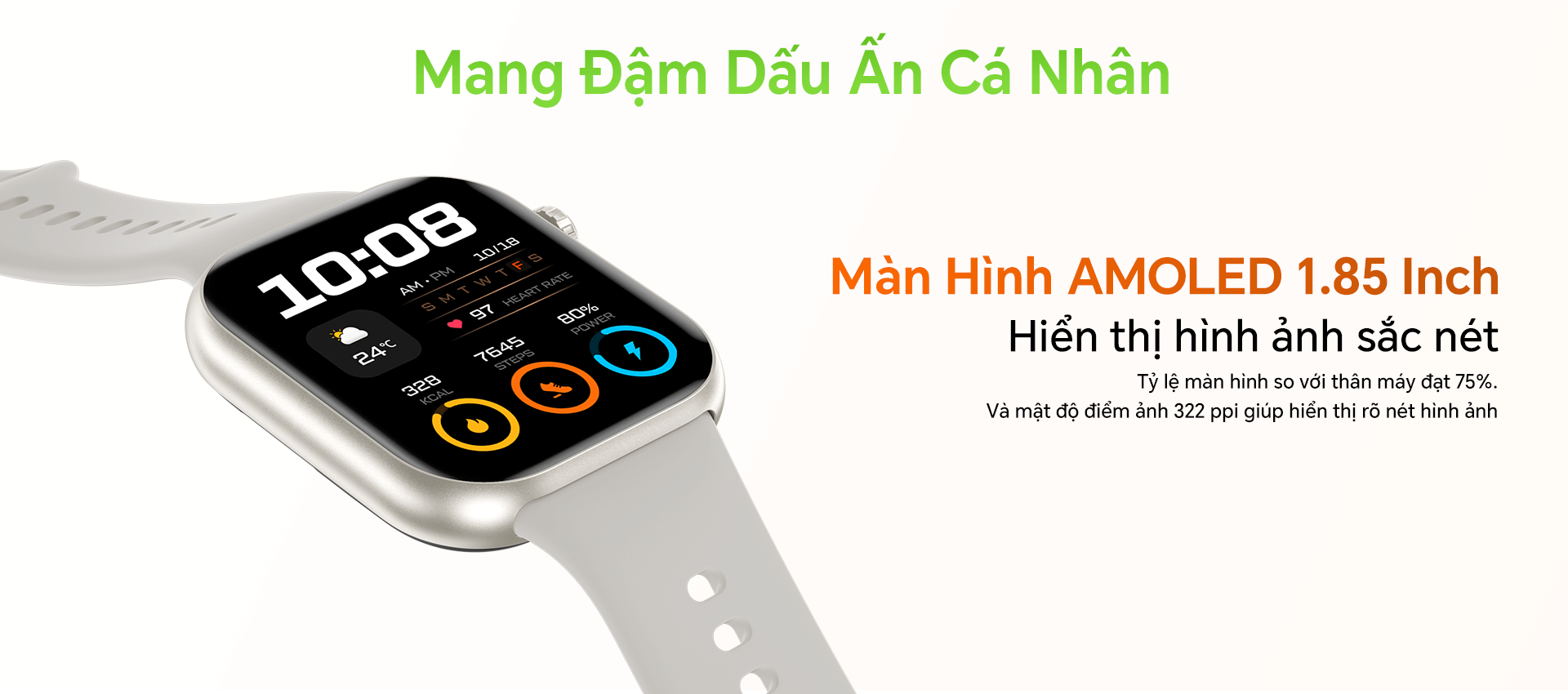 Màn hình AMOLED 1.85 inch hiển thị hình ảnh sắc nét.