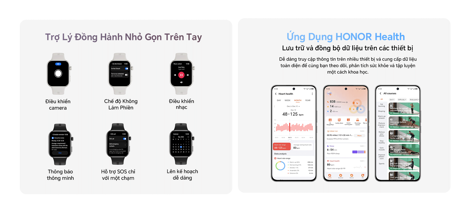 8. Khả năng nhận diện tự động bài tập có thể thay đổi tùy vào tư thế, thời gian và mức độ chính xác khi thực hiện bài tập. Các bài chạy và hướng dẫn giãn cơ yêu cầu sử dụng ứng dụng HONOR Health.