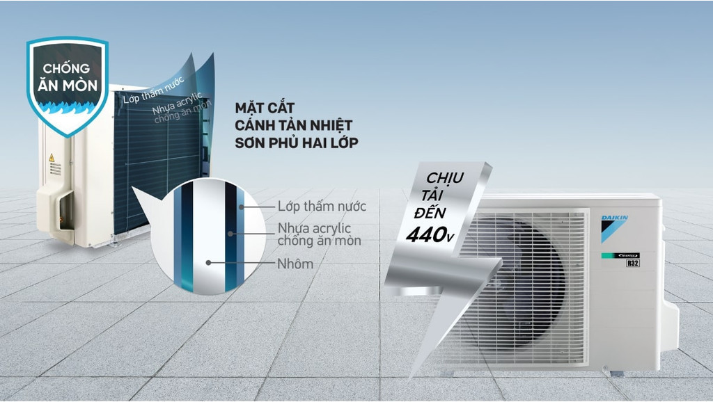 Dàn nóng được Daikin cực kỳ chú trọng, trang bị nhiều công nghệ để bảo vệ. Phần ống dẫn gas được làm bằng đồng với lá tản nhiệt bằng nhôm, vừa đảm bảo hiệu quả trao đổi nhiệt, vừa tăng cường khả năng chống ăn mòn. Hơn nữa, phần cánh quạt tản nhiệt cũng được phủ thêm 2 lớp tĩnh điện: nhựa Acrylic và lớp chống thấm nước giúp máy hoạt động bền bỉ kể cả trong điều kiện mưa axit hay có sự tác động của muối biển.