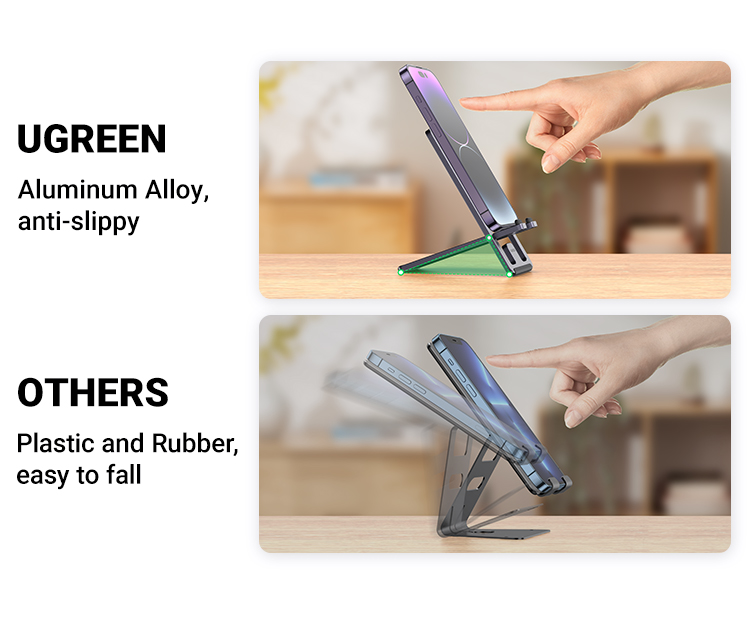 😎Ổn định & Đáng tin cậy: Giá để bàn cho điện thoại di động UGREEN đủ chắc chắn để hỗ trợ các thiết bị lên đến 7,2 inch và 300g. Giá đỡ để bàn điện thoại thông minh kết hợp giá đỡ ABS chắc chắn, bản lề giảm chấn bằng kim loại chắc chắn với tấm đỡ tăng lên (95mm * 54mm), giữ điện thoại của bạn ở vị trí chắc chắn. Không lung lay ngay cả khi gõ vào giá đỡ. Thêm vào đó, Giá đỡ để bàn Điện thoại có đệm cao su để đảm bảo gắn chắc chắn và tránh các vấn đề trượt.