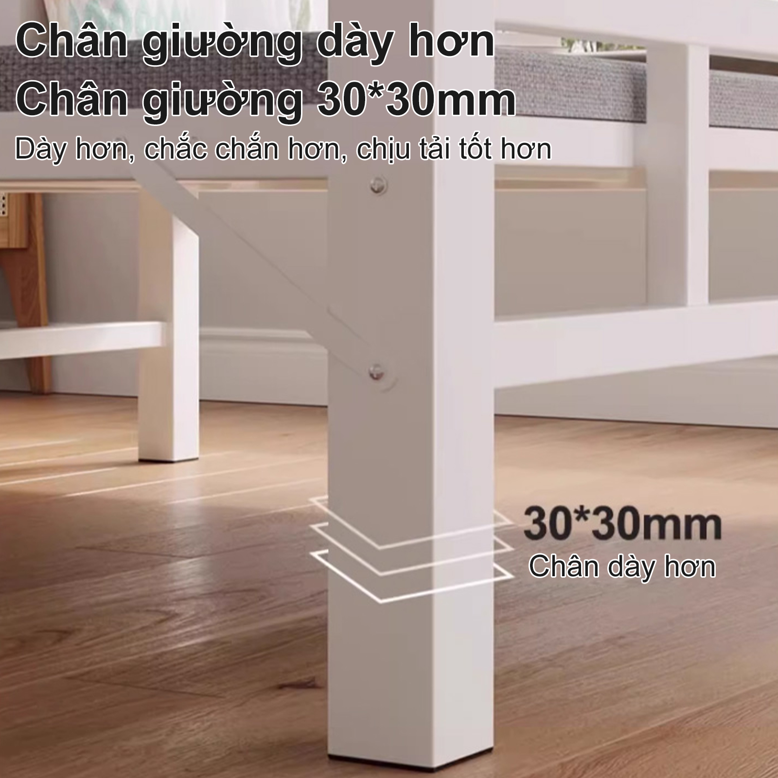Thiết kết từ khung thắp sơn tĩnh điện dạng sơn hấp của nhà máy, màu sơn sắc sảo và độ bền cao chống gỉ sét trong quá trình sử dụng. Phần song ngang của giường được cố định theo ô khung thép và được đan bởi những cọng thép nhỏ bền chắc giúp giường sử dụng không bị lún, thụng như những sản phẩm thông thường.