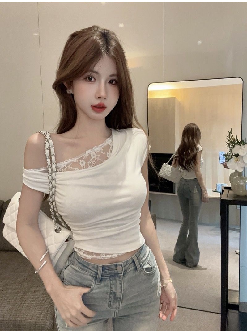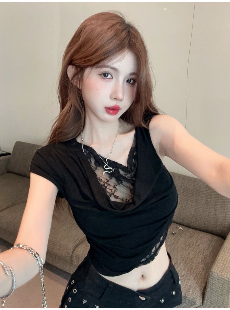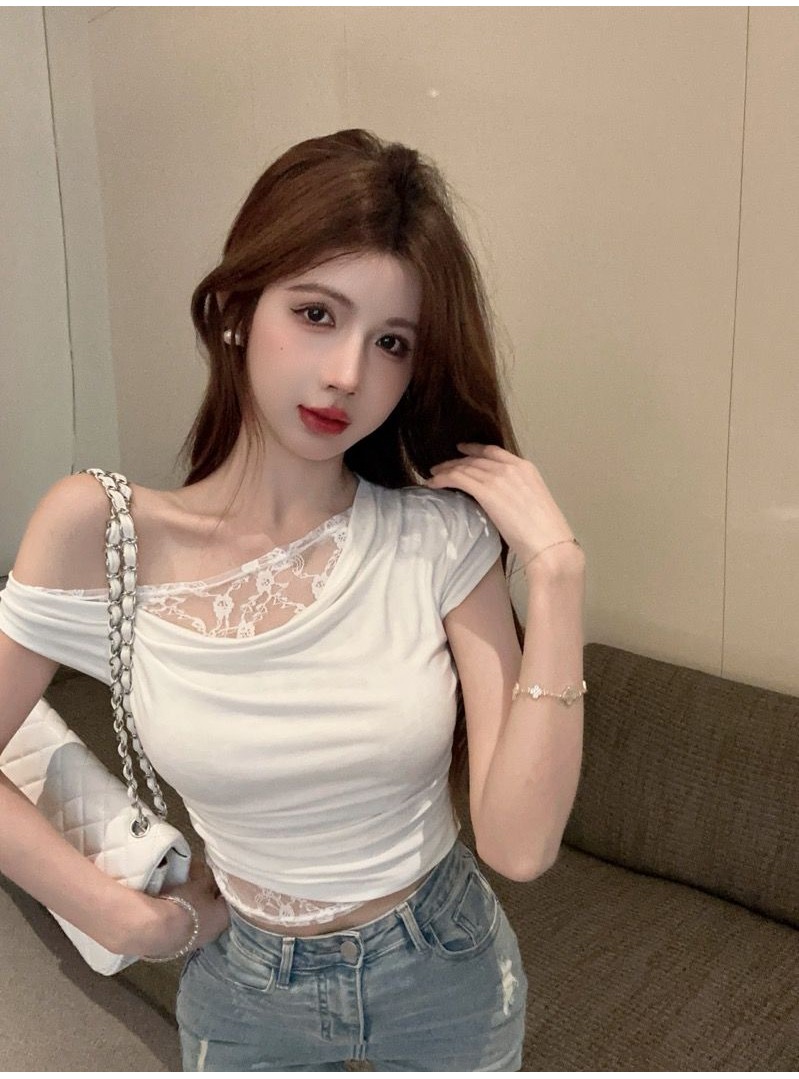 Gợi Cảm Phong Cách Cô Gái Nóng Cổ Xoay Thiết Kế Thời Trang Bất Đối Xứng Đeo Vai Ngắn Tay Ren Khâu Thiết Kế Giả Hai Mảnh Ngắn Top Mùa Hè Slim fit Crop Ngắn