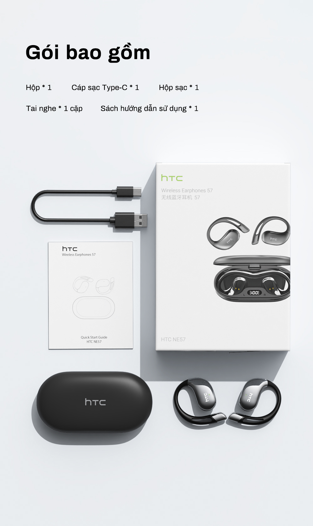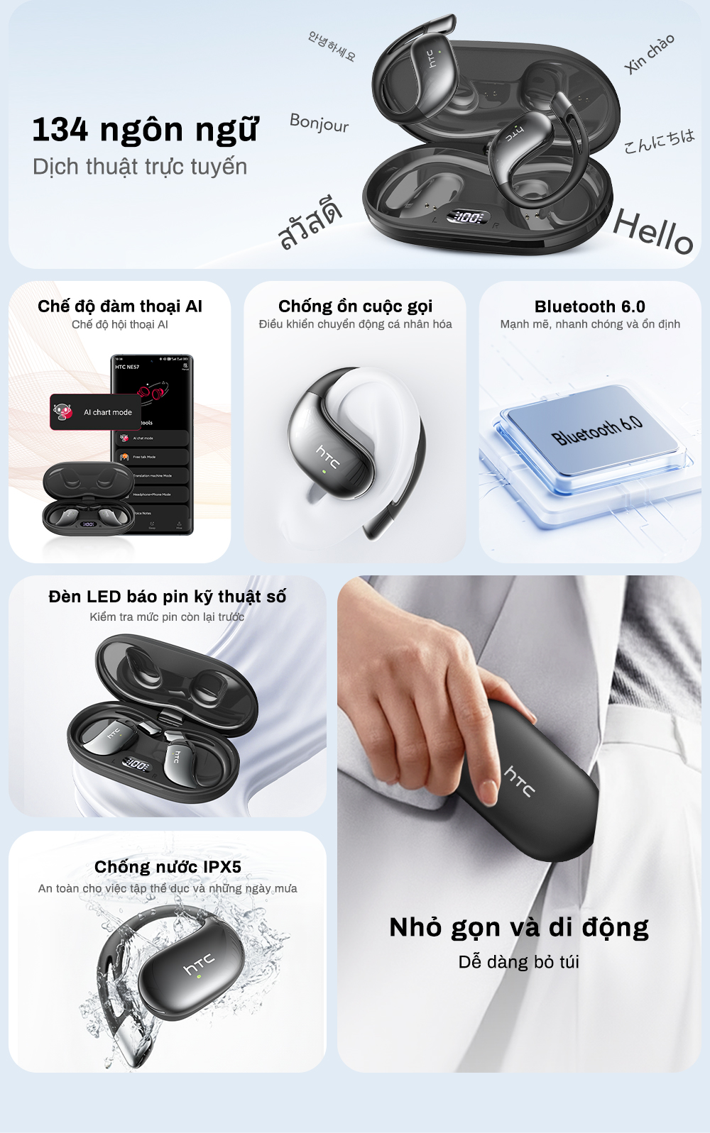 HTC NE57 Tai nghe phiên dịch AI dịch thuật đồng thời 134 ngôn ngữ Bluetooth 6.0 Âm thanh nổi HiFi Thiết kế thời trang Tai nghe không dây