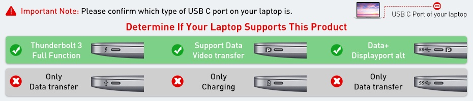 3.Trước khi mua, vui lòng đảm bảo máy tính xách tay / điện thoại / PC của bạn hỗ trợ DP ALT MODE. có nghĩa là cổng USB c trên thiết bị của bạn có thể hỗ trợ đầu ra video, đồng bộ hóa dữ liệu và các chức năng sạc trước khi mua.