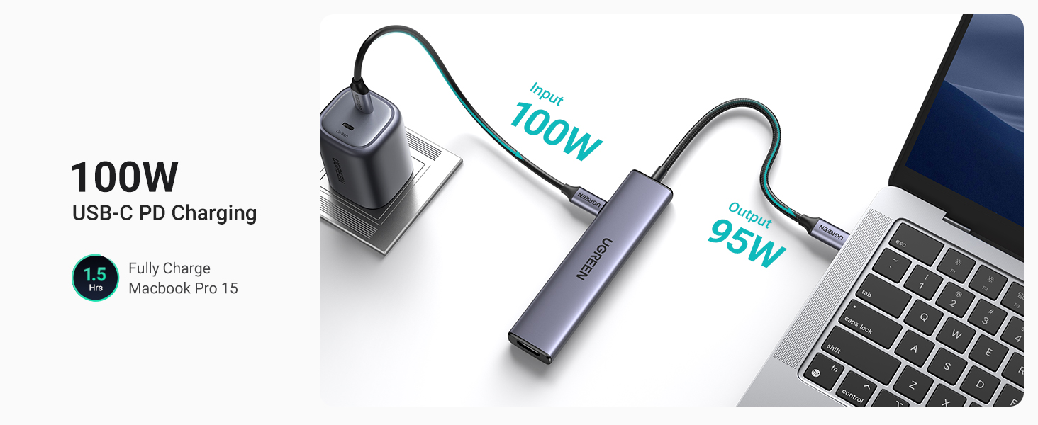 ●Sạc 100W: Hỗ trợ sạc truyền qua USB C lên đến 95W qua cổng Loại C để giữ cho máy tính xách tay của bạn được cung cấp năng lượng. 5W được dành riêng cho các hoạt động giao diện khác. Khi trình diễn truyền hình hoặc truyền tệp, vui lòng không cắm hoặc rút bộ sạc PD để tránh mất hình ảnh hoặc dữ liệu.