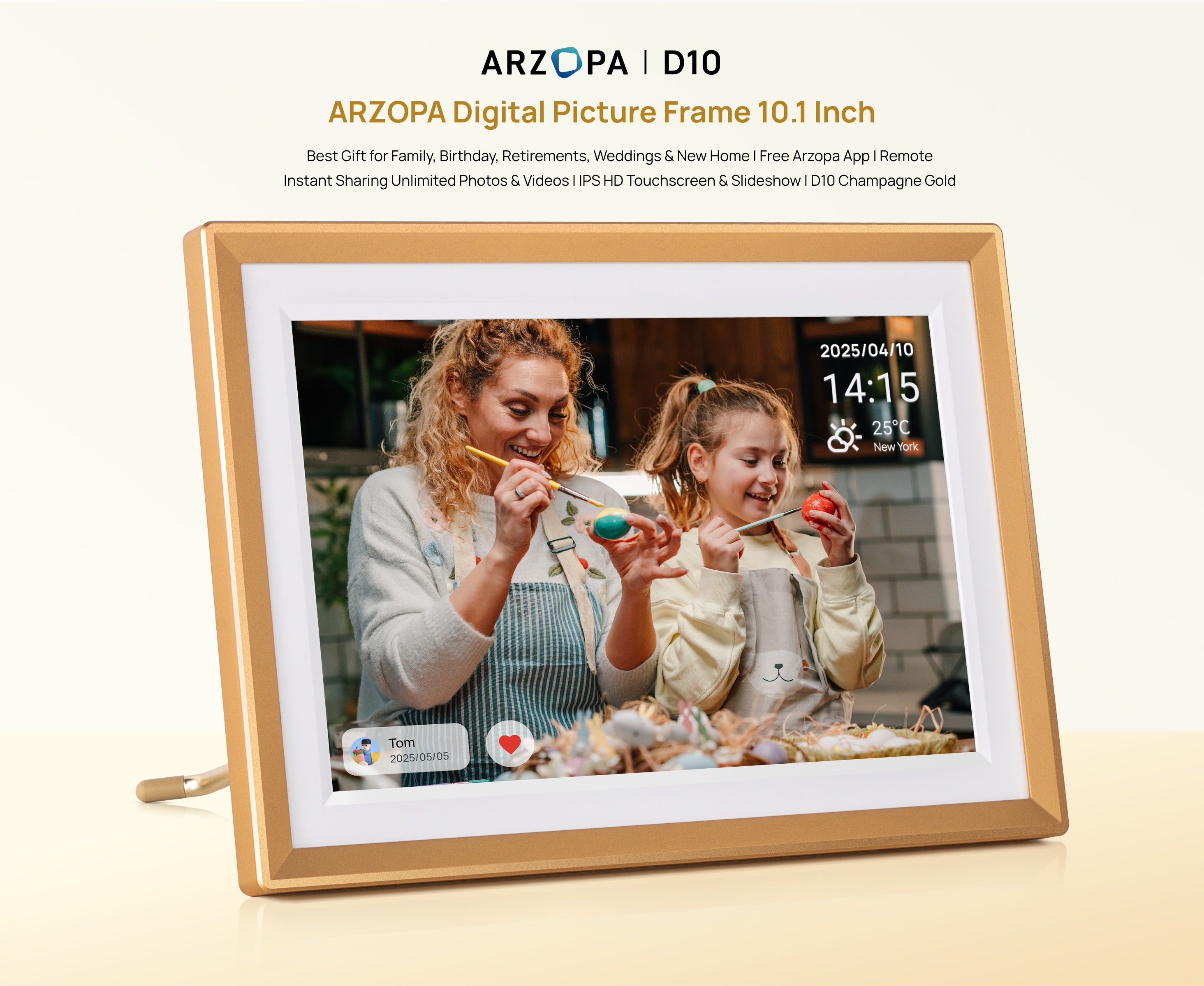 Khung ảnh kỹ thuật số bằng kim loại WiFi ARZOPA 10.1 ", Màn hình cảm ứng HD IPS, Dễ dàng chia sẻ ảnh / video qua ứng dụng miễn phí, Khung quà tặng thông minh tùy chỉnh cho gia đình - Vàng D10
