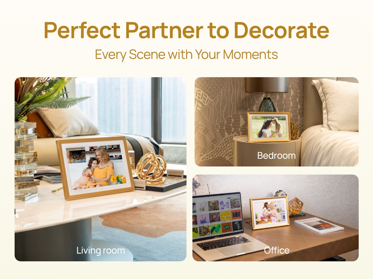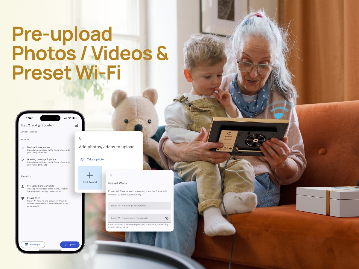 "Thiết kế thông minh và thân thiện với người dùng" Chức năng cài đặt trước sáng tạo cho phép thiết lập WiFi và tải lên nội dung trước khi tặng - người nhận chỉ cần cắm và chạy. Tạo quà tặng được cá nhân hóa với nội dung và cài đặt tùy chỉnh cho người đặc biệt đó. Tự động xoay giữa các chế độ dọc / ngang với cảm biến trọng lực chính xác. Hỗ trợ cả vị trí đặt máy tính để bàn và treo tường. Hoạt động đơn giản với hướng dẫn thiết lập 3 bước lý tưởng cho người cao tuổi.